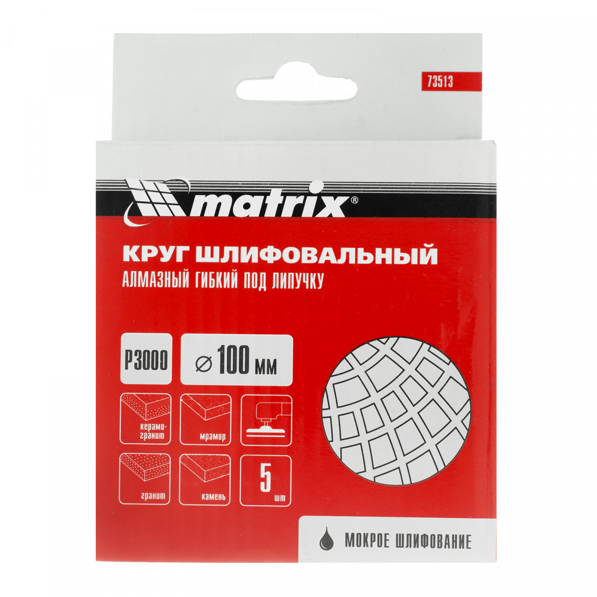 Алмазный гибкий шлифовальный круг Matrix 73513 диаметром 100 мм, с зернистостью P 3000, 5 шт. в упаковке, предназначен для мокрого шлифования и используется при проведении строительных, отделочных и художественных работ. Абразив зернистостью P 3000 позволяет проводить финишную обработку — полировать и доводить до глянцевого блеска гранитные, каменные, керамогранитные и мраморные поверхности. Рабочая часть выполнена из светло-зеленого термопластика с алмазным напылением и подходит для использования на цветных и черных материалах. Гибкая основа круга облегчает шлифовку рельефных элементов. Круг используется на УШМ с установленной опорной тарелкой для АГШК.