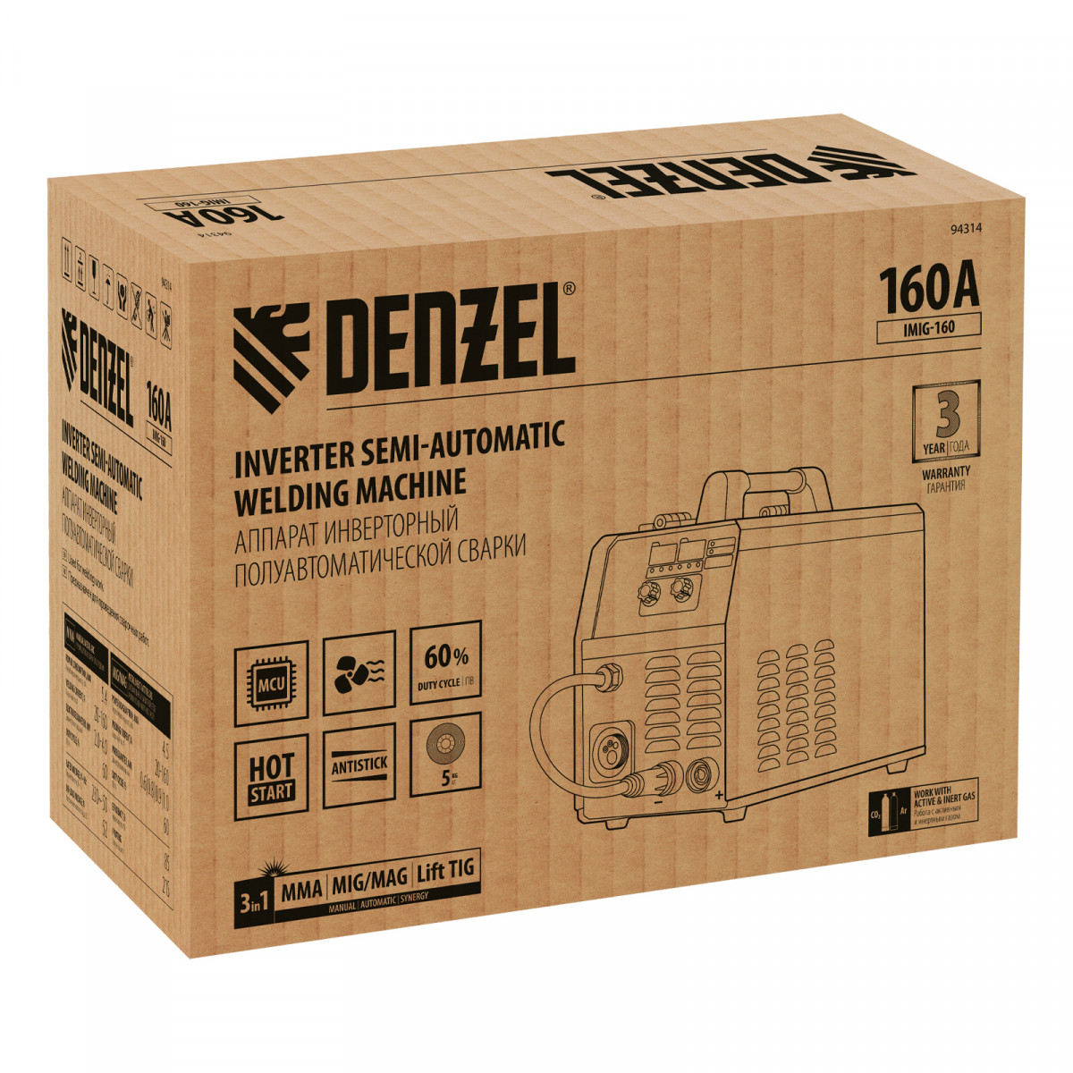 Инверторный аппарат полуавтоматической сварки Denzel IMIG-160 94314 работает со сварочным током до 160 А, характеризуется продолжительностью включения 60% и совместим с катушками до 5 кг. Используется для сварки углеродистых и нержавеющих сталей с использованием постоянного тока. Эффективен для работы с тонкостенными заготовками.,Сварочный аппарат произведен по технологии IGBT, что обеспечивает стабильную и эффективную работу на протяжении длительного времени. Синергетическое управление упрощает работу и позволяет получить сварной шов неизменно высокого качества. Аппарат автоматически подбирает оптимальные значения напряжения, скорости подачи проволоки и другие параметры.