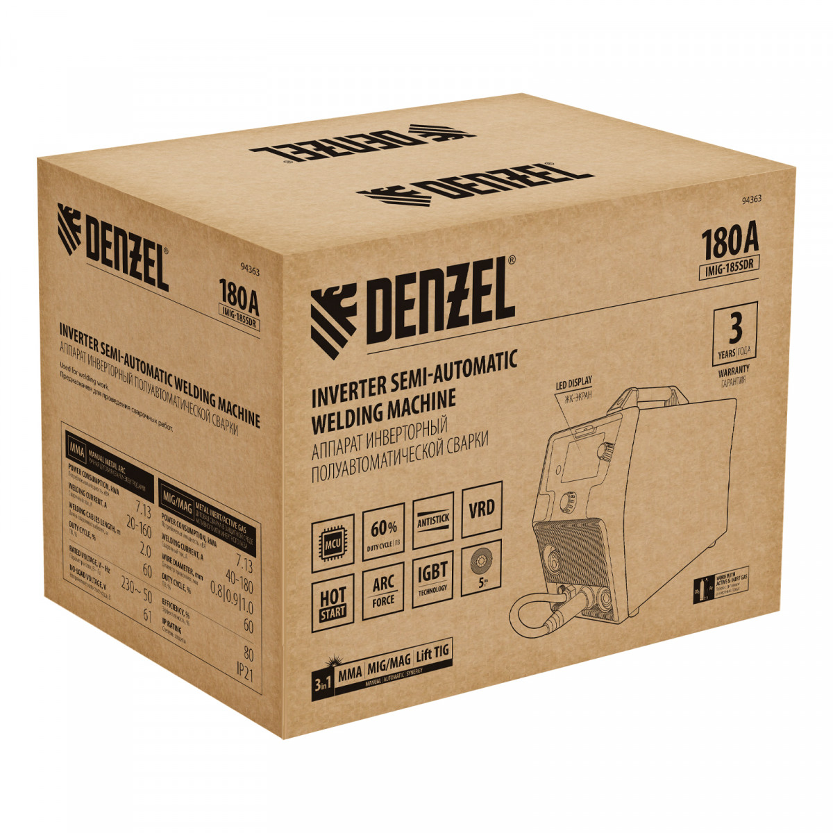 Аппарат инвертор. полуавтомат. cварки IMIG-185SDR, 180 А, ПВ 60%, катушка 5 кг Denzel