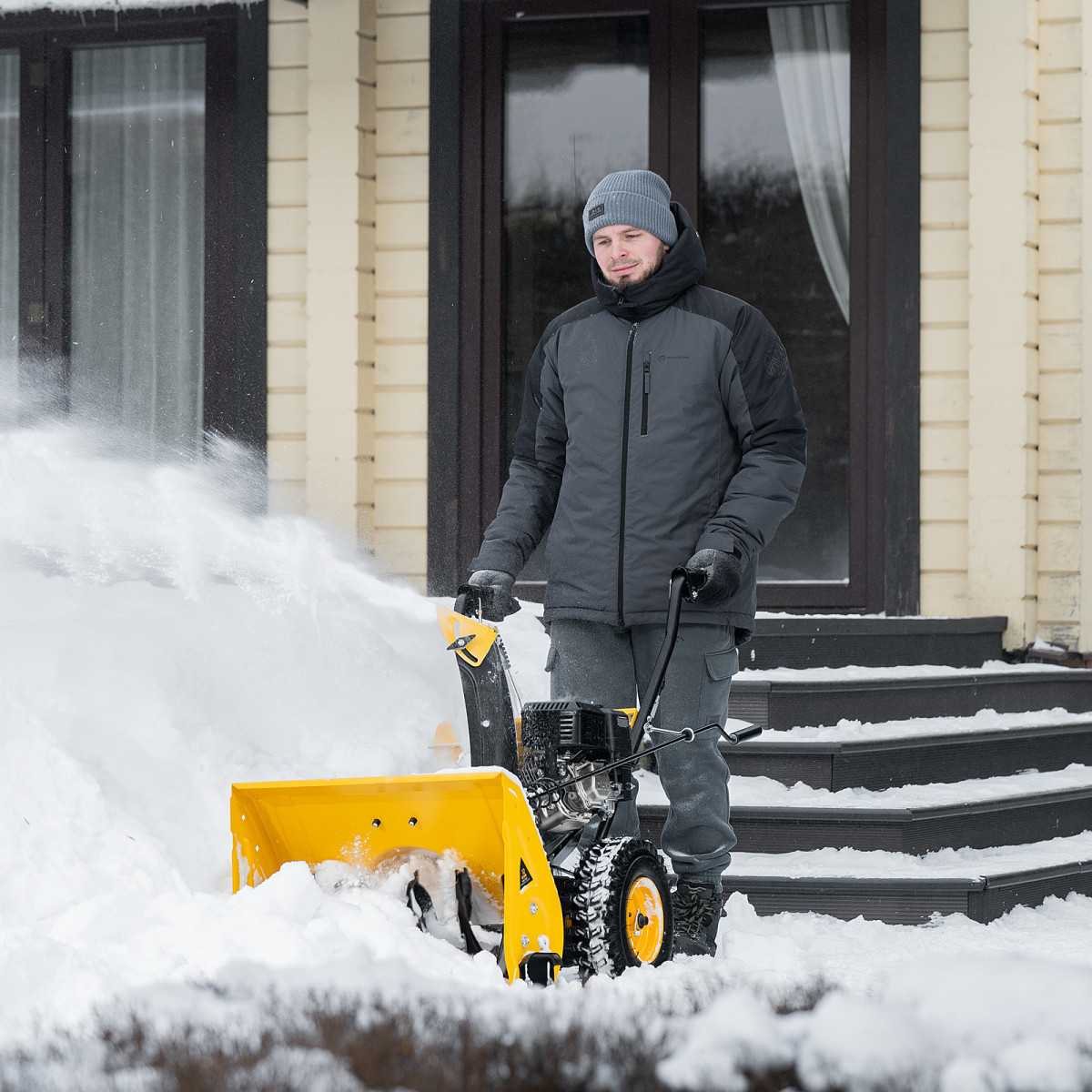 • Экономия сил и времени — снегоуборочная машина оснащена приводом на колеса, а значит, ее не придется толкать во время работы.