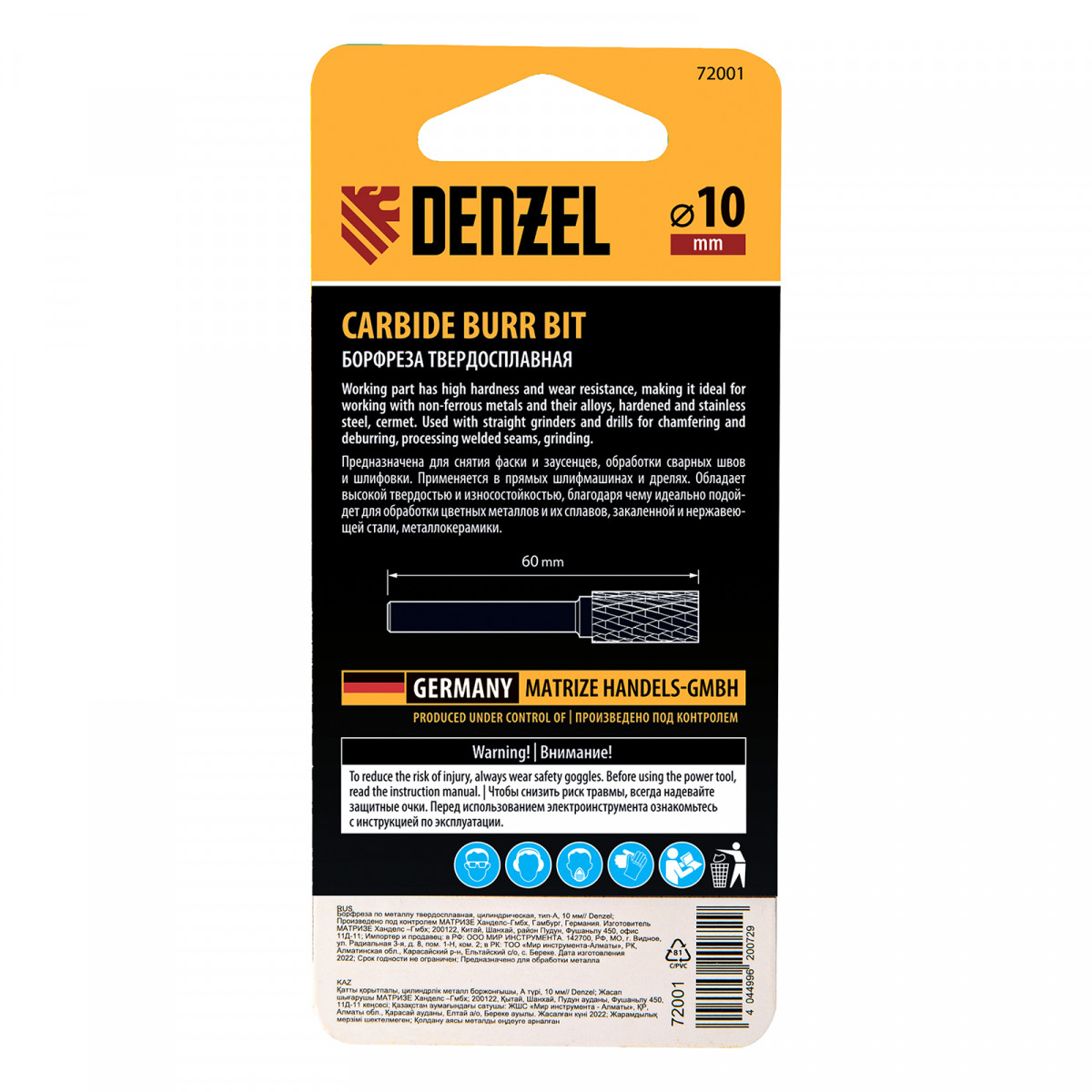 Твердосплавная борфреза Denzel 72001 с цилиндрической рабочей частью (тип A), диаметром 10 мм, используется для работ по металлу (закаленной и нержавеющей стали, латуни, меди, бронзе, чугуну, титану). Подходит также для обработки искусственного камня и металлокерамики. Предназначена для завершающей обработки и подгонки форм и поверхностей: шлифовки, зачистки сварных швов, удаления заусенцев, снятия фасок, разделки кромок. Оснастка устанавливается на прямошлифовальную машину или дрель.