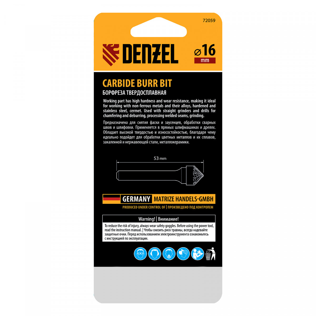 Твердосплавная борфреза по металлу Denzel 72059 с рабочей частью-зенкером с вершиной 90° (тип K), диаметром 16 мм, устанавливается на дрель или прямошлифовальную машину. Используется для обработки закаленной и нержавеющей стали, латуни, бронзы, меди, чугуна, титана, а также металлокерамики и искусственного камня. Оптимальна для снятия фасок и заусенцев, обработки кромок, угловых пазов, краев отверстий.