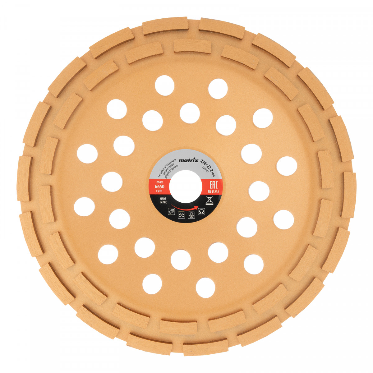 Двухрядная алмазная зачистная чашка Matrix 72991 диаметром 230 мм, с посадочным отверстием 22,2 мм, — оснастка для углошлифовальных машин, предназначенная для грубой обработки бетонных, каменных, кирпичных, мраморных и гранитных поверхностей. Позволяет проводить зачистку швов, стыков, неровностей, удаление наплывов. Придает поверхности шероховатость для улучшения ее адгезивной способности перед нанесением строительных растворов. Чашка предназначена для профессионального применения.