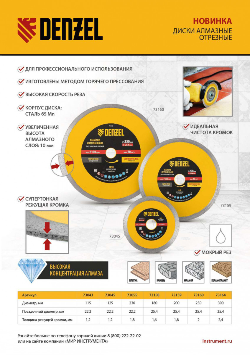 Алмазный диск ТМ Denzel "Сплошной" арт 73045, ф125 х 22,2 мм, предназначен для мокрого резания мрамора, керамогранита и керамическую плитки, камня. Устанавливается на УШМ (болгарку) или плиткорез с посадочным диаметром 22,2 мм. Высокая концентрация алмазов и супертонкая рабочая часть диска обеспечивает идеальную частоту кромок и высокую скорость реза.Диск произведен по технологии горячего прессования с увеличенной шириной режущей кромки (10мм) подходит для профессионального использования и больших объемов работ.