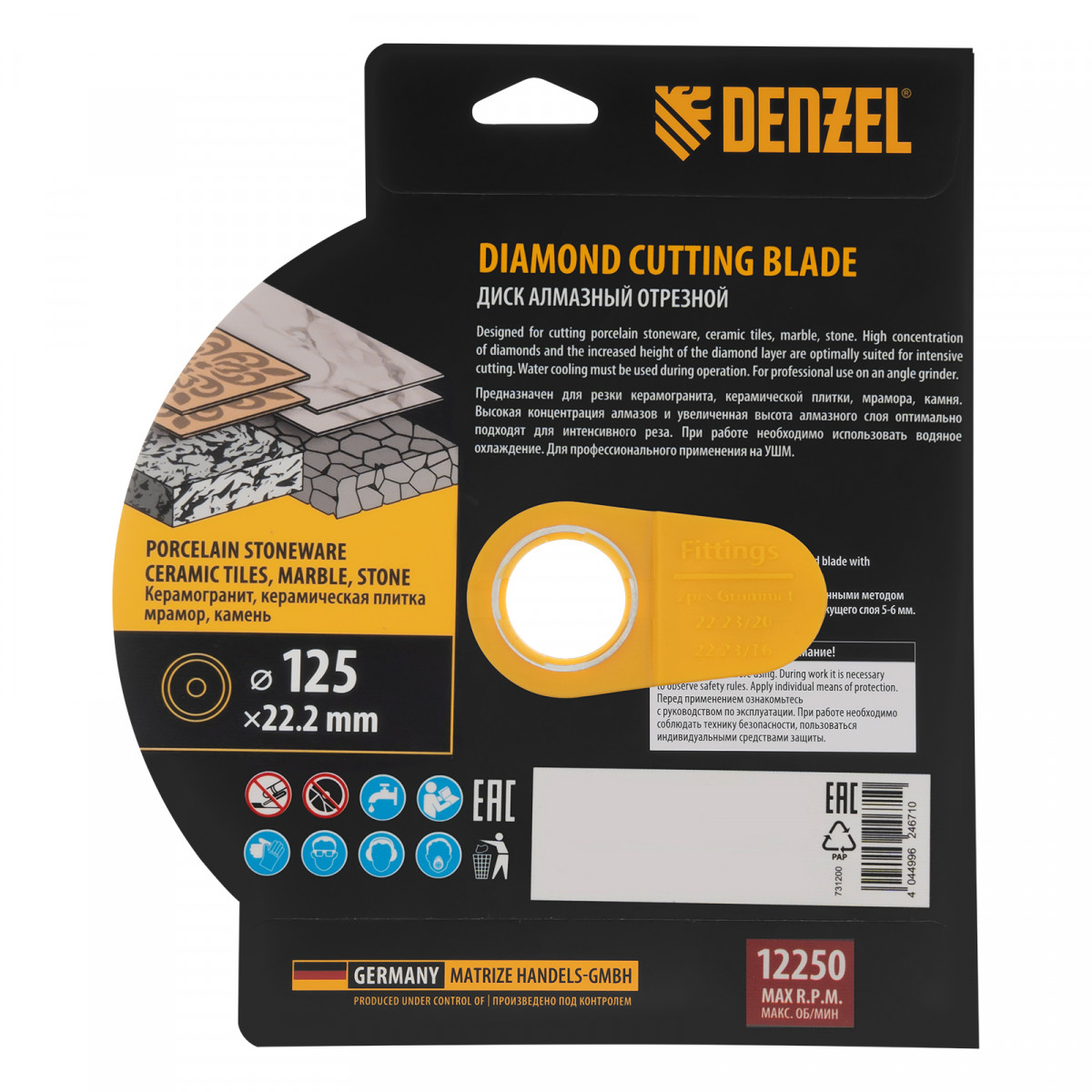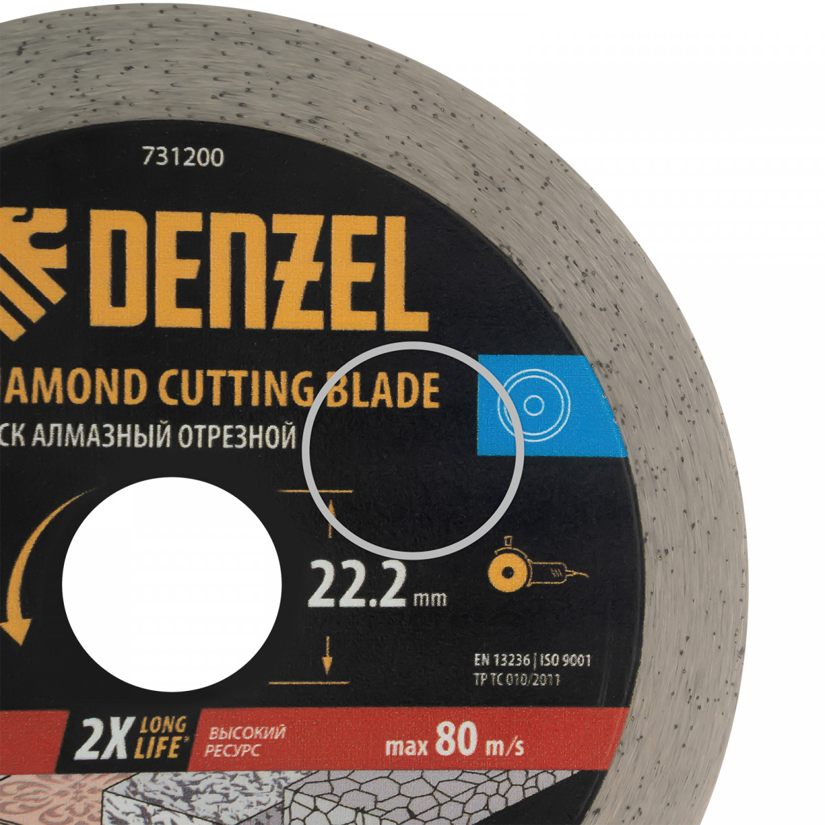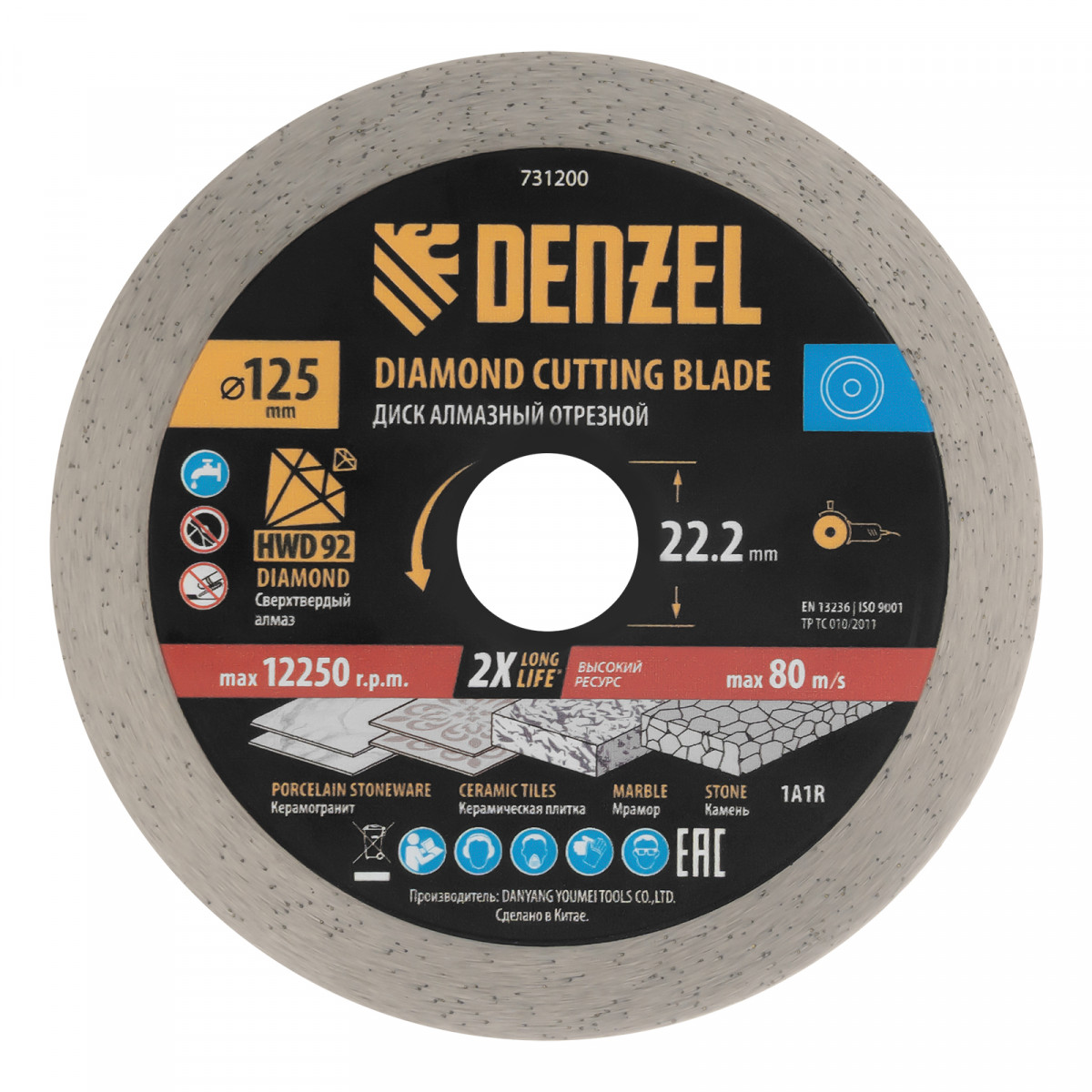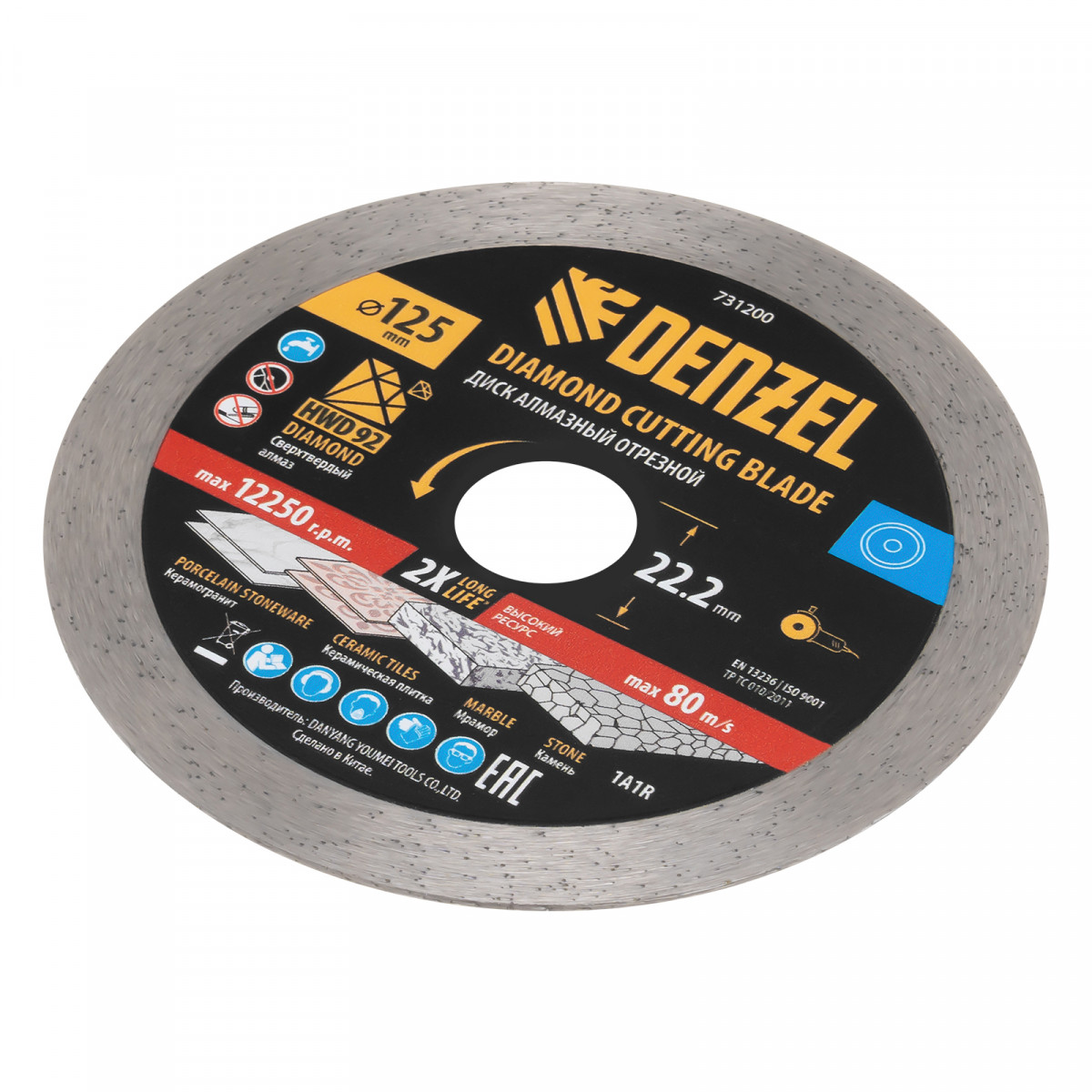 Алмазный отрезной диск Denzel 731200 диаметром 125 x 22,2 мм, со сплошной рабочей частью и слоем сверхтвердых алмазов HWD92, предназначен для мокрого резания твердых материалов. Оптимален для работы с керамогранитом, керамической плиткой, мрамором, камнем. Устанавливается на УШМ, поддерживающую частоту вращения 12250 об/мин. Необходимо использование водяного охлаждения для наиболее эффективной работы и увеличения ресурса оснастки.