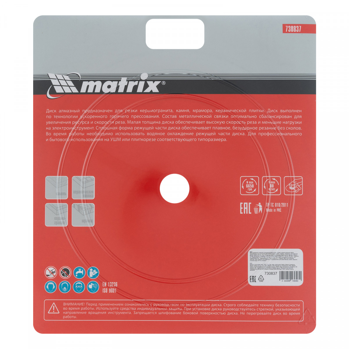 Диск алмазный, отрезной сплошной, 230 х 22.2 мм, тонкий, мокрая резка Matrix Professional