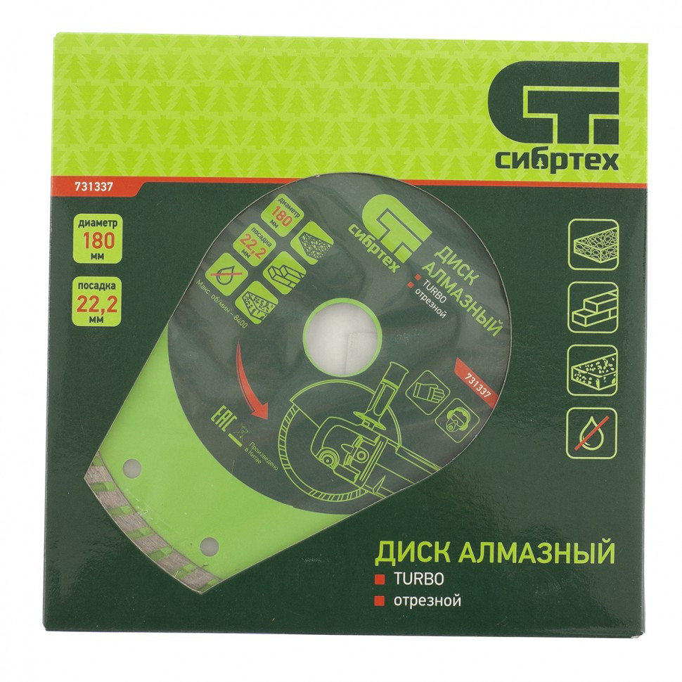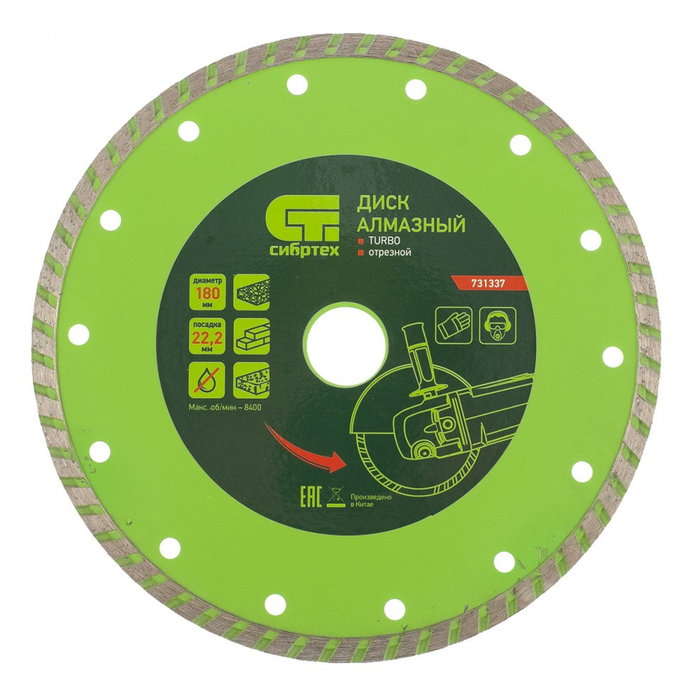 Алмазный отрезной диск Сибртех Turbo 731337 для сухой резки, диаметром 180 х 22,2 мм, устанавливается на углошлифовальную машину. Позволяет резать твердые материалы: бетон, железобетон, камень, песчаник. Диск предназначен для бытового использования.