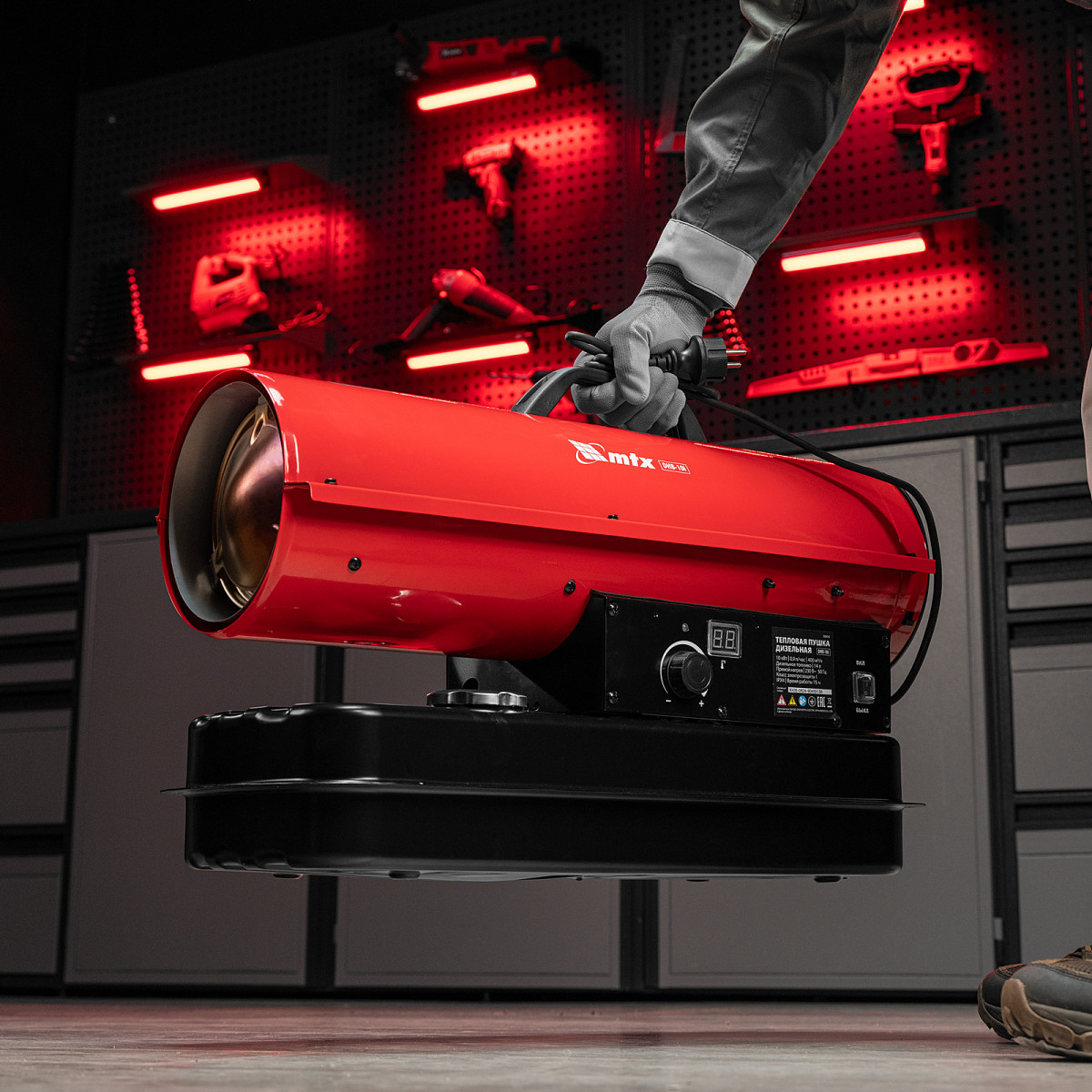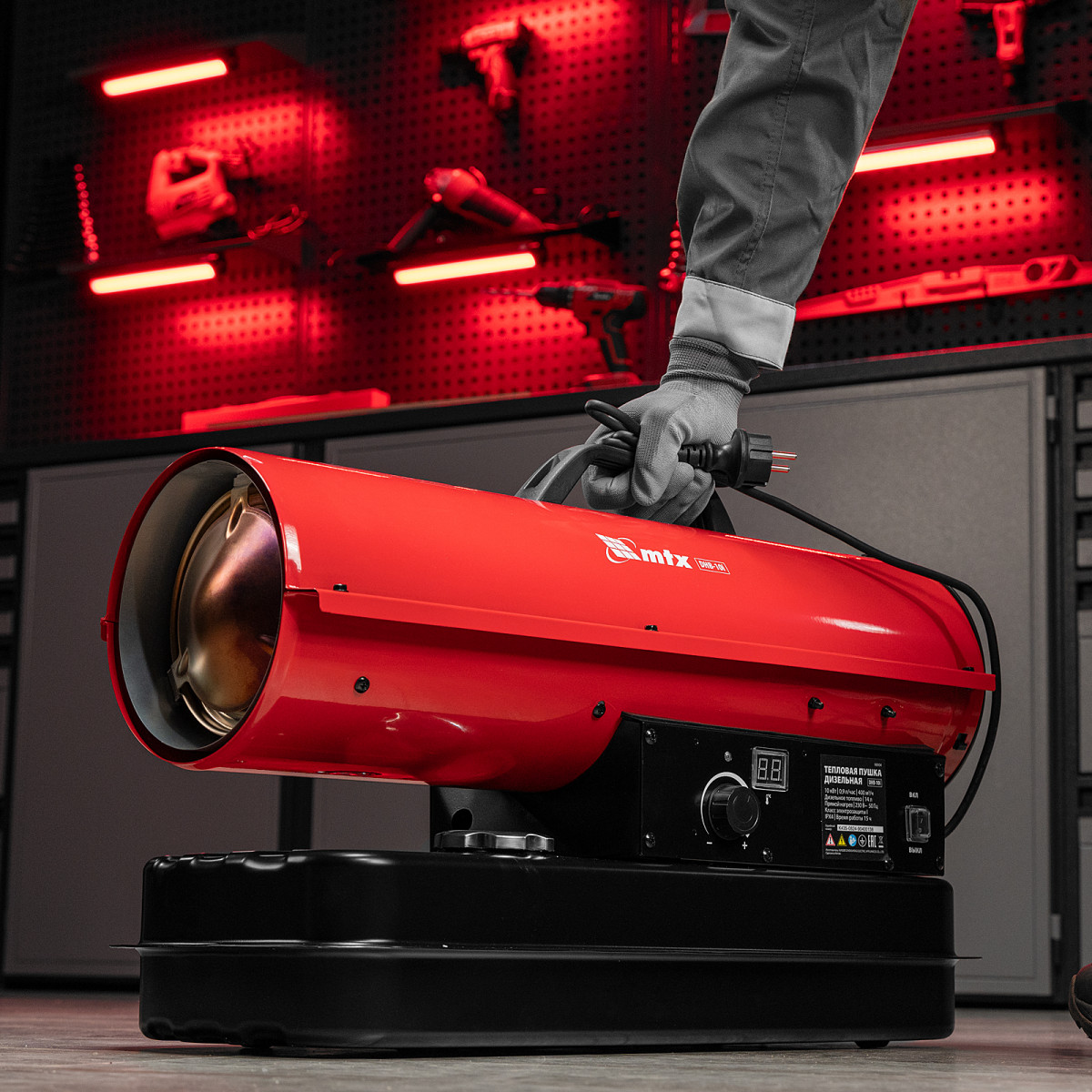 Дизельная тепловая пушка MTX DHB-10i 98904 тепловой мощностью 10 кВт и производительностью 400 м3/ч, с прямым типом нагрева и термостатом, предназначена для обогрева складов, цехов, теплиц и других нежилых помещений. Также используется на производстве и в строительстве: для прогрева бетона, просушки стен и разморозки траншей.