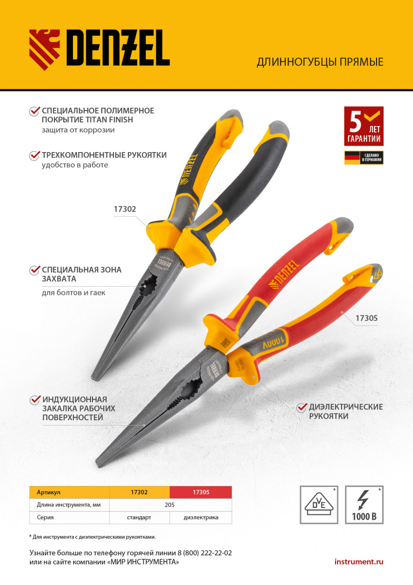 Длинногубцы прямые 205 мм, трехкомпонентные рукоятки Denzel