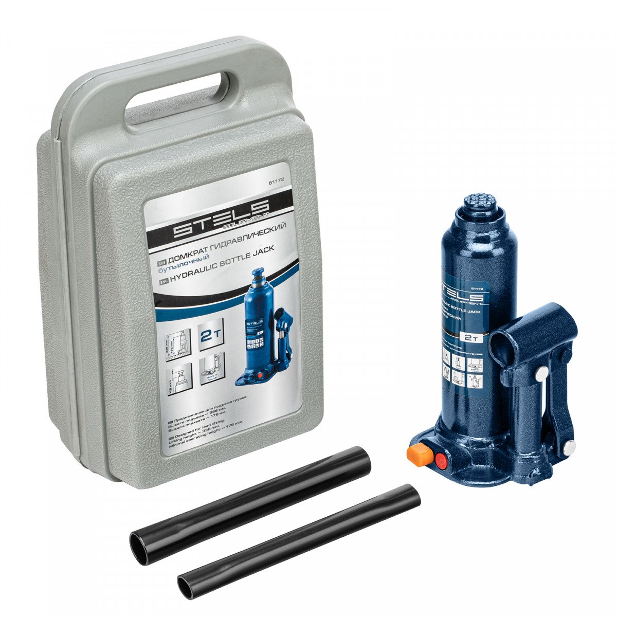 Домкрат гидравлический бутылочный, 2 т, h подъема 178-338 мм, в пластиковом кейсе Stels