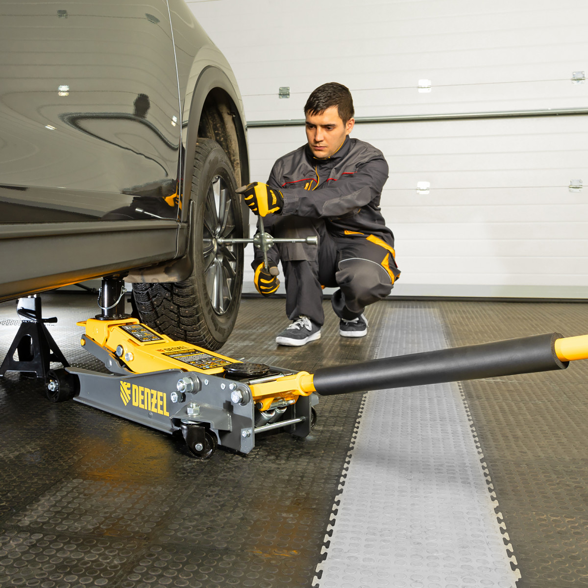 - Аккуратная работа — резиновая опора и прорезиненная рукоятка защищают кузов и днище автомобиля от нежелательных повреждений.