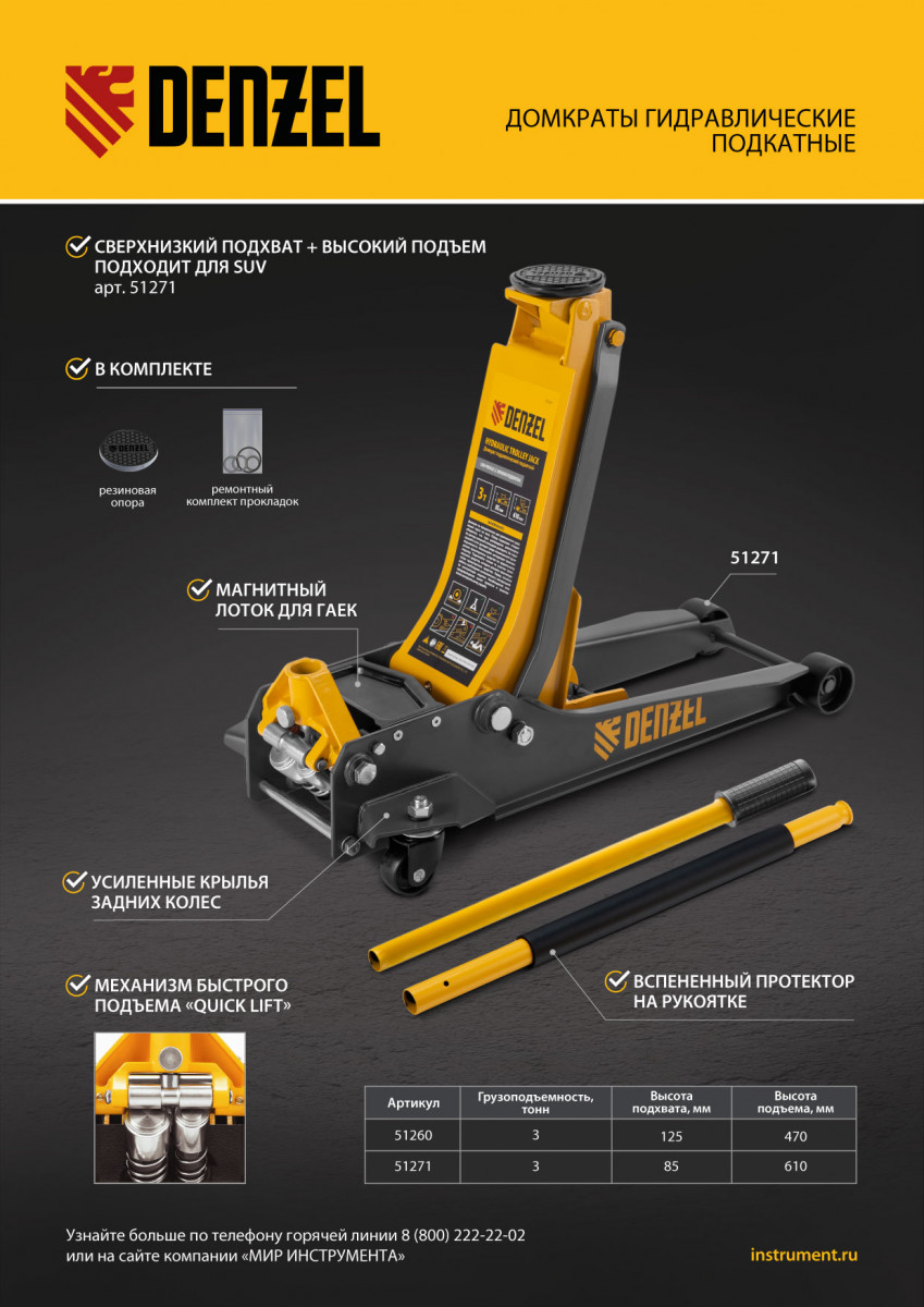 Профессиональный подкатной гидравлический домкрат Denzel 51260 используется для быстрого подъема на высоту 125-470 мм всех типов автомобилей с любым клиренсом и массой до 3 тонн. В гидравлическом блоке предусмотрено 2 насоса (система быстрого подъема QUICK LIFT), благодаря чему для достижения предельной высоты достаточно 6 качков рукоятки. Домкрат подходит для использования на станциях профессионального техобслуживания и шиномонтажа, а также для личного использования.