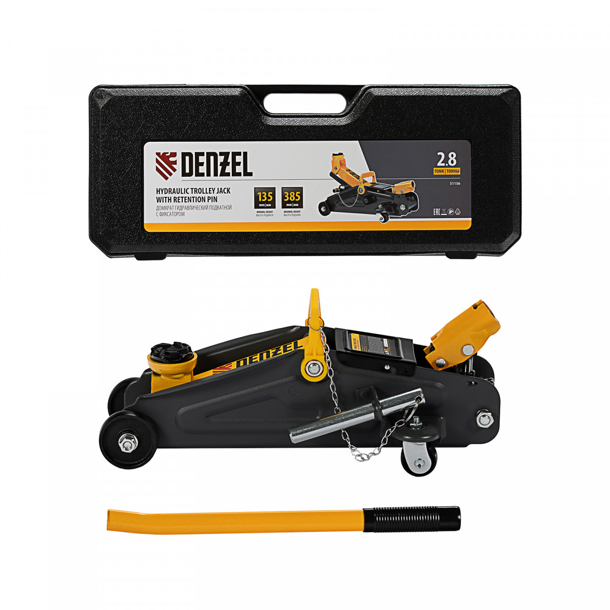 Домкрат гидравлический подкатной с фиксатором, 2,8 т, 135-385 мм, в кейсе Denzel