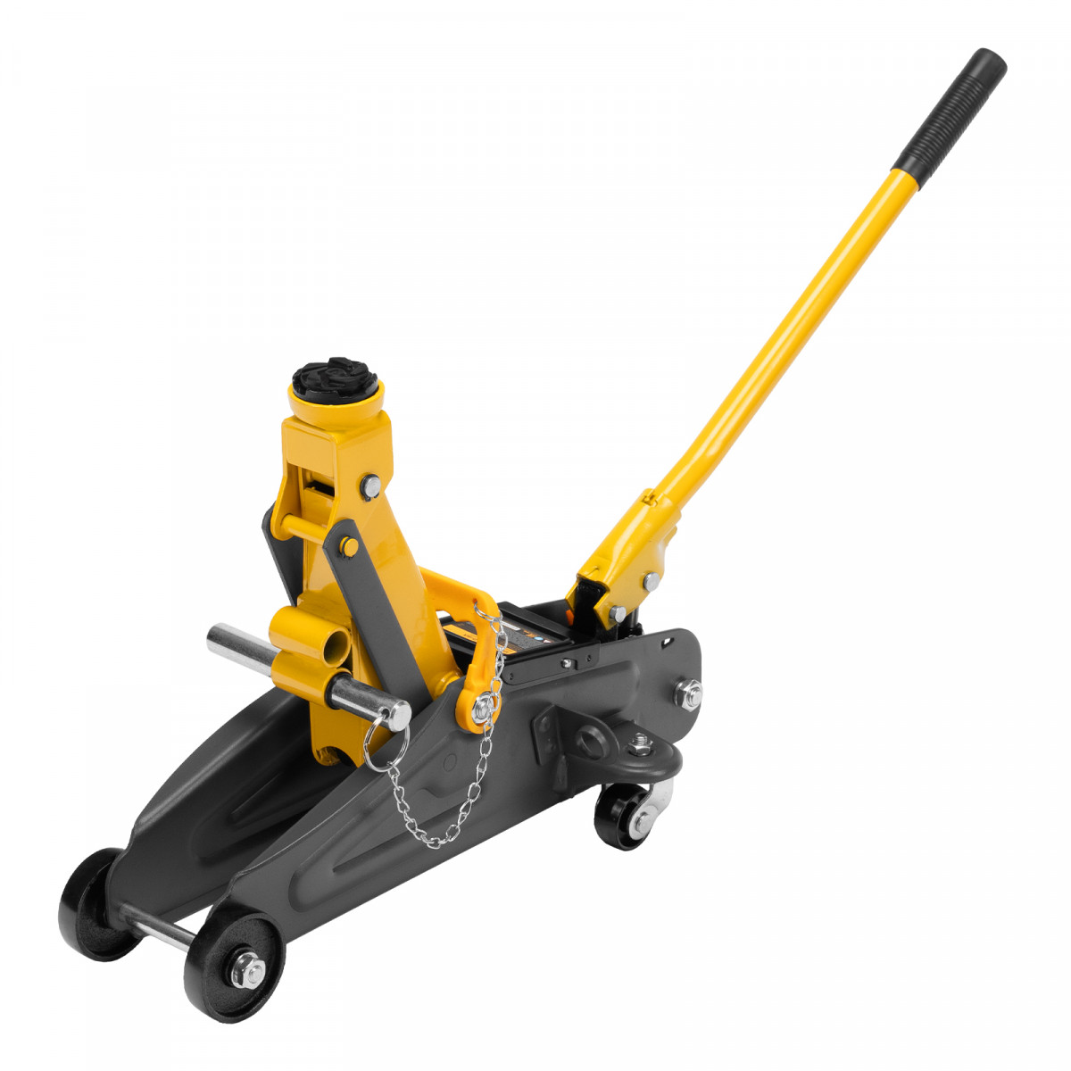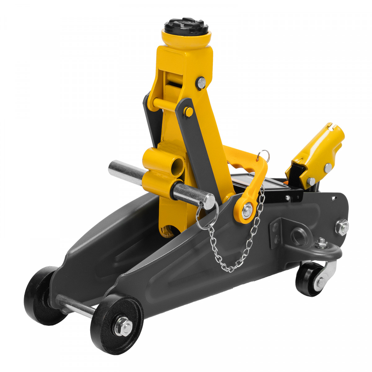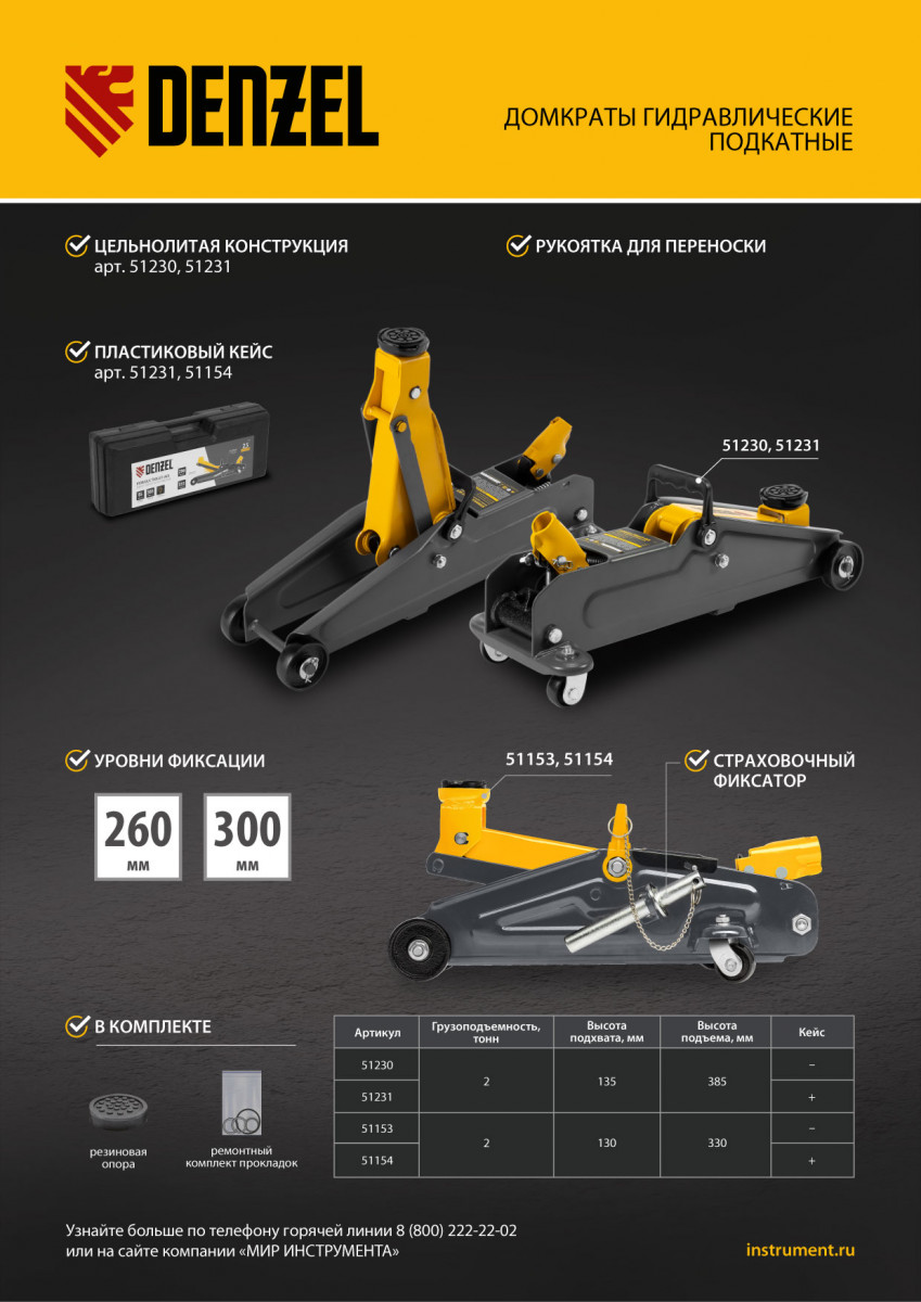 Гидравлический подкатной домкрат с фиксатором Denzel 51154, с высотой подхвата 130 мм, предназначен для плавного подъема грузов массой до 2 т на высоту до 330 мм. Страховочный штифт позволяет фиксировать подъемный рычаг на высоте 260 и 300 мм для безопасной работы. Домкрат пригодится владельцам легковых автомобилей со стандартным клиренсом.
