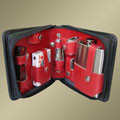 Сумочка-барсетка из искусственной кожи с внутренней отделкой из натуральной кожи, фляжка и воронка для заполнения фляжки из нержавеющей стали, рюмки из стального сплава