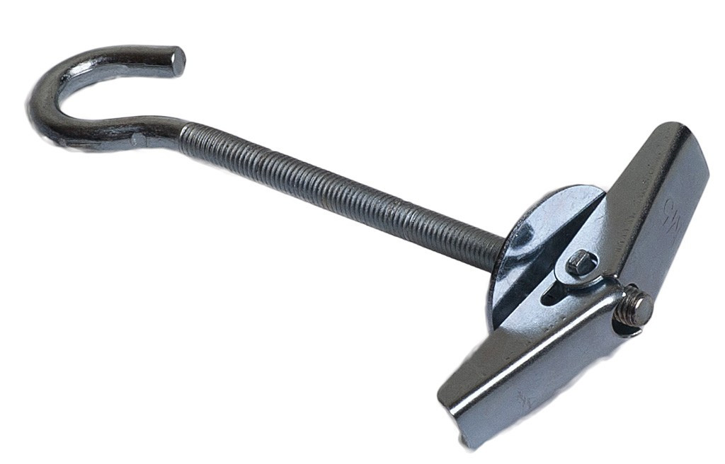 Складной пружинный дюбель с крюком широко используется для монтажа, крепления подвесных элементов различной тяжести, таких как люстры, растяжки и прочее. Складной дюбель применяется только в том случае, если между потолком и поверхностью несущей конструкции имеется зазор. Складной дюбель с крюком представляет собой анкерное крепление следующей конструкции: стержень с нанесенной резьбой, на который навинчивается гайка, шайба тарельчатой формы и пружинный механизм со стопорными складными крыльями. Дюбель пружинный с крюком изготовляется из стали, которая затем пассируется и покрывается оцинкованный сплавом.