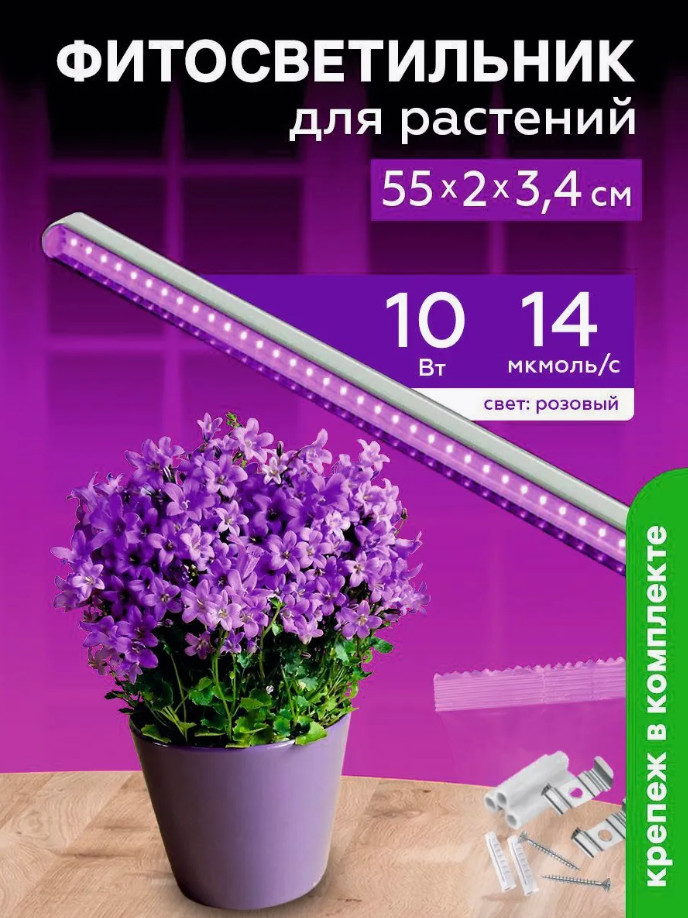 Розовое свечение повторяет спектр требующийся растениям для фотосинтеза и служит для освещения и досветки декоративных растений, ароматных трав, рассады, что позволяет использовать данную модель на протяжении всего года. Мощность светильника в составляет 10 Вт, площадь освещения 0,8-1,5 м2. Корпус фитосветильника изготовлен из алюминия, окрашенного в белый цвет. Рассеиватель из прозрачного полимерного материала. Выключатель расположен на корпусе. Степень пылевлагозащиты светильника IP40. Длина кабеля питания - 1,2 метра. Класс энергопотребления А+. Простой накладной монтаж.