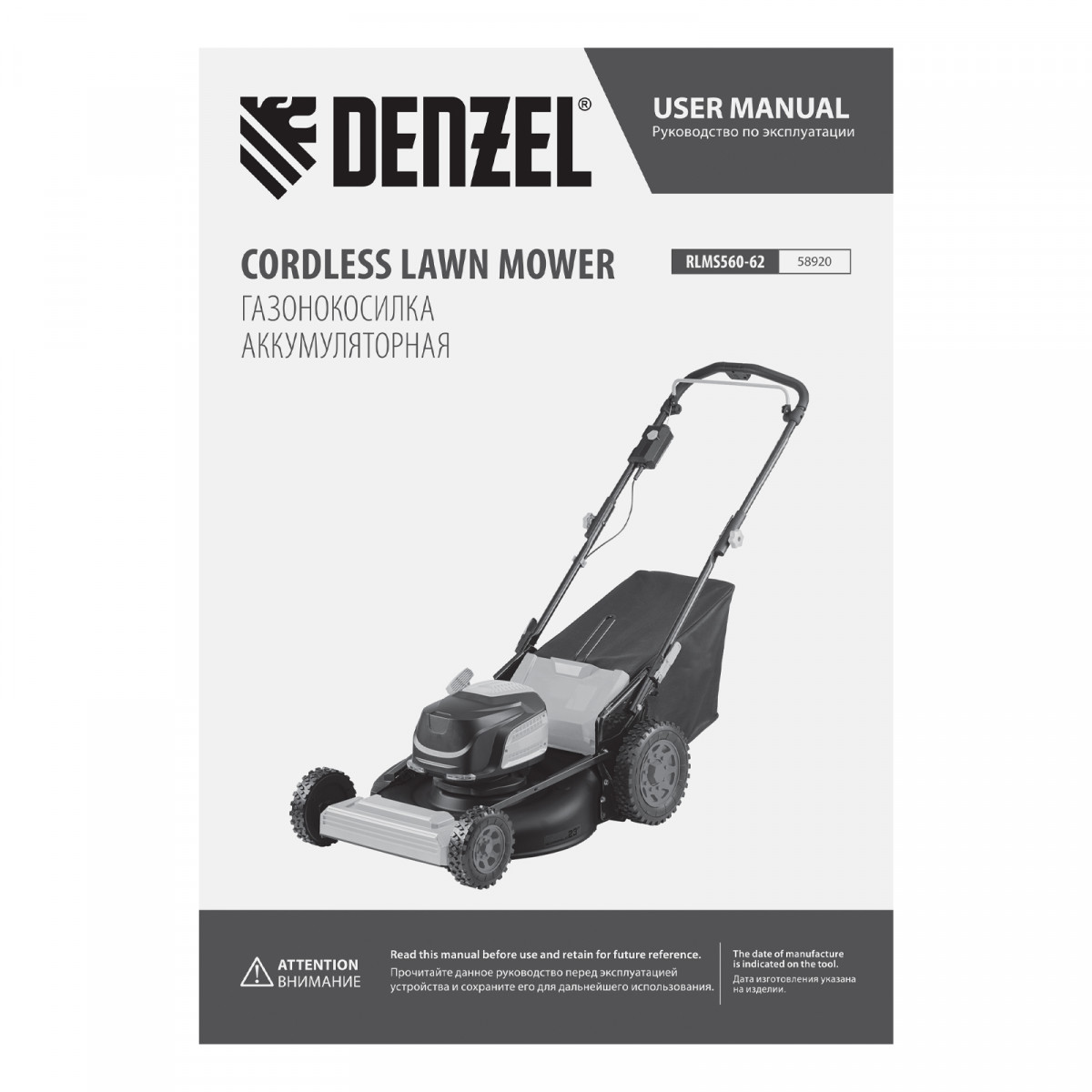Газонокосилка аккумуляторная бесщет., RLMS560-62, привод, 560 мм, Li-ion, 62В Denzel