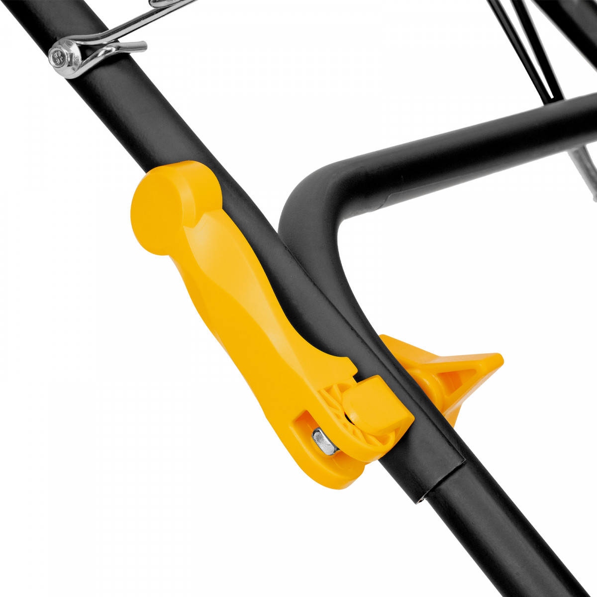 - Простая регулировка высоты скашивания — достаточно установить рычаг в нужное положение.