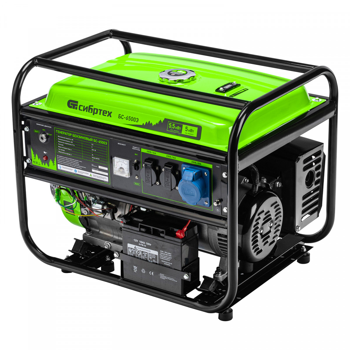 Бензиновый генератор Сибртех БС-6500Э 94548 максимальной мощностью 5,5 кВт, с 4-тактным двигателем, электростартером и баком объемом 25 л, выдает напряжение 230 В и используется для электроснабжения на даче, на строительной площадке, в магазине, в мастерской или гараже. Мощности хватает для обеспечения работы электроинструмента или одновременного подключения 4 ламп накаливания, телевизора, плиты и холодильника. Благодаря электростартеру запуск генератора осуществляется одним поворотом ключа.