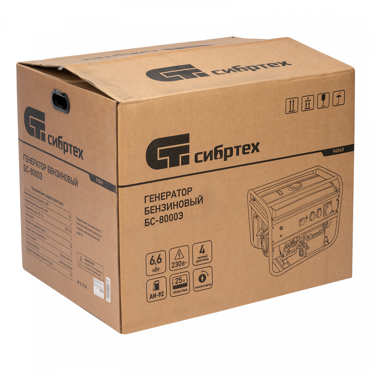 Генератор бензиновый БС-8000Э, 6,6 кВт, 230В, четырехтактный, 25 л, электростартер Сибртех