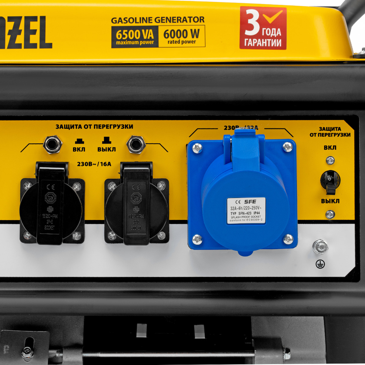 Генератор бензиновый GE 7900, 6.5 кВт, 220 В/50 Гц, 25 л, ручной пуск Denzel