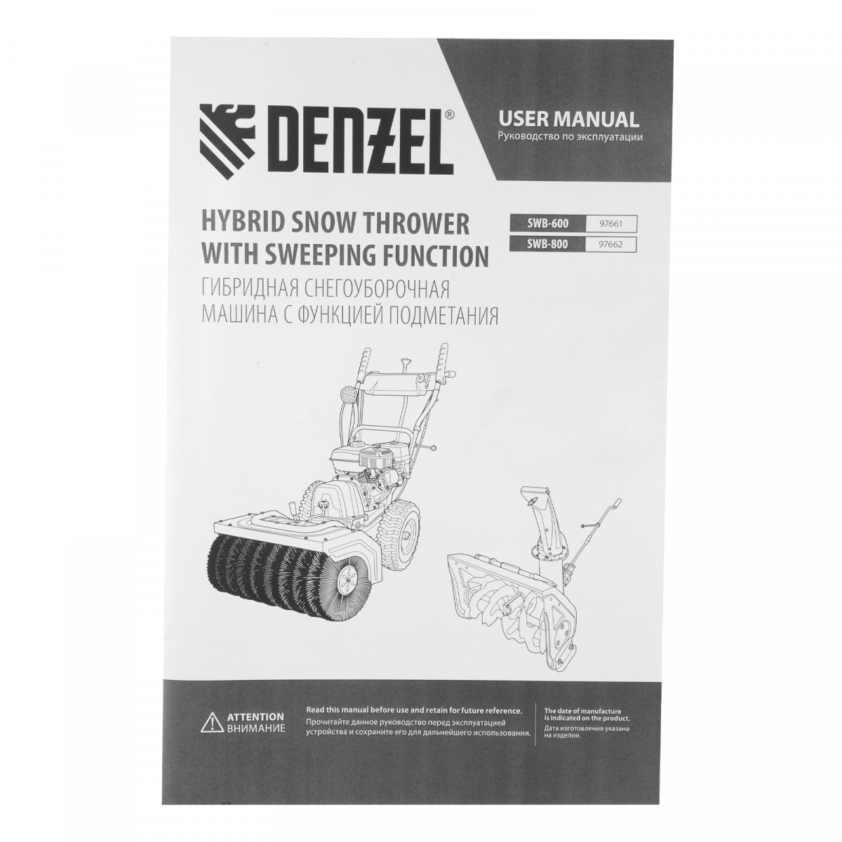 Гибридная снегоуборочная машина с функц. подметания SWB-800, 212 сс, руч. старт, 2 насадки// Denzel