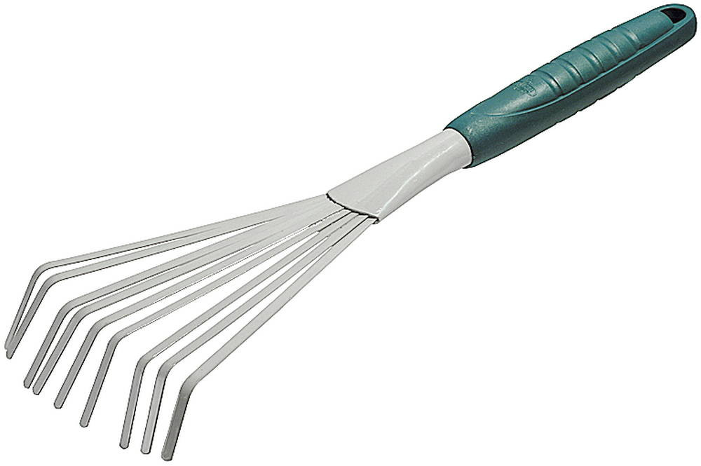 Девять зубцов из упругих плоских стальных прутьев с общей шириной рабочей части 175 мм покрыты защитной краской. Ударопрочная ручка.