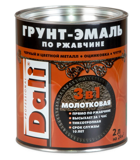 Грунт-эмаль DALI обладает тройным действием: защищает от ржавчины, создает эффект молотковой поверхности и придает красивый зеленый оттенок. Универсальное средство для защиты металлических поверхностей от коррозии.