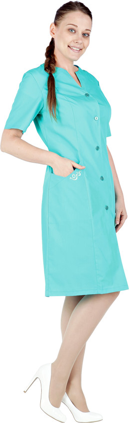Халат: - полуприлегающий силуэт; - центральная застёжка на петли и пуговицы - на кокетке; - рельефные швы на полочке и спинке; - горловина фигурной формы; - рукав короткий; - накладные карманы с вышивкой в шве деталей полочки; - хлястик на спинке.