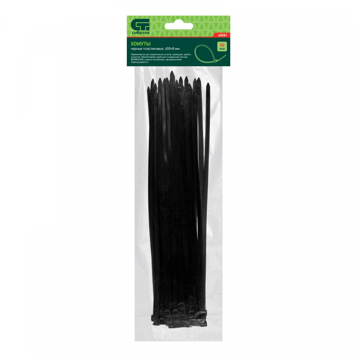 Черные пластиковые хомуты Сибртех 45581, 400 х 8 мм, 50 шт. в упаковке, используются для стяжки кабелей, закрепления трубок, шлангов, рекламных конструкций, а также для упаковки различных предметов. Пригодятся во время прокладки электрических и локальных вычислительных сетей, ремонта компьютерной техники, оформлении торговых стендов, комплектовании товара, будут также полезны дома, на даче и в гараже.