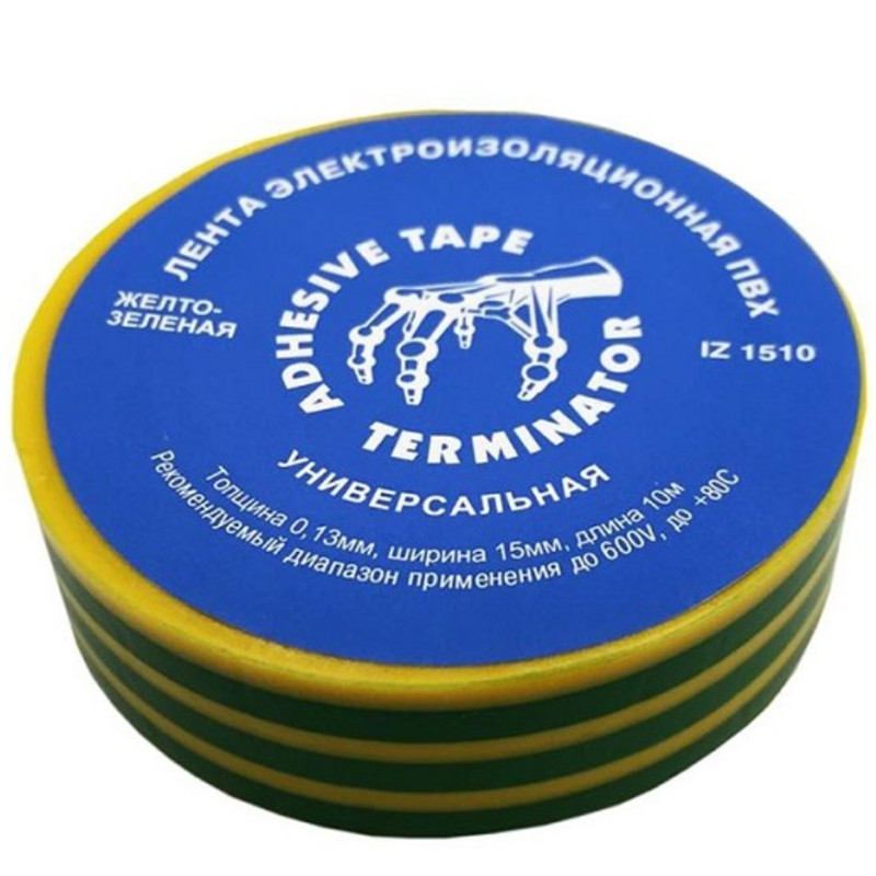 Универсальная изолента IZ 1510 Terminator, желтая/зеленая — долговечный и неизменно мягкий и эластичный дизайн ленты ПВХ в сочетании со специальным акриловым клеем позволяют достигать хороших результатов при проведении электромонтажных работ в различных отраслях. - размеры ленты 15мм х 10м - толщина ленты 0,13мм - глянцевая, цвета желто/зеленая.