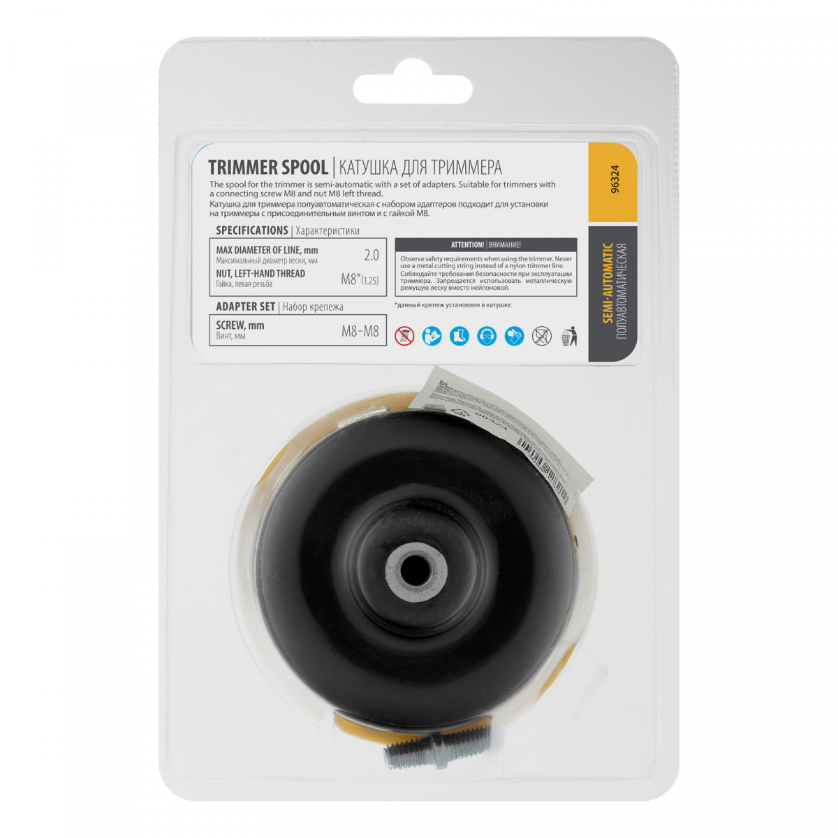 Полуавтоматическая триммерная катушка Denzel 96324 с легкой заправкой лески предназначена для использования с электрическими и бензиновыми косами, а благодаря адаптеру совместима с моделями, имеющими как присоединительный винт M8-M8, так и гайку M8 x 1,25. Максимально возможный диаметр лески составляет 2 мм, что позволяет скашивать газонную траву и густые заросли.