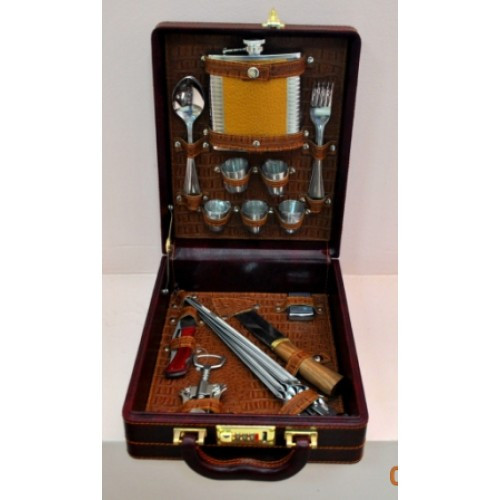 Внутренняя отделка кейса – кож.зам.Фляга – 1 шт. 16 унц.Нож складной – 1 шт.Нож туристический – 1 шт.Зажигалка – 1 шт.Штопор – 1 шт.Рюмки – 5 шт. нержавеющая сталь.Вилки – 5 шт.Ложки – 5 шт.Шампура – 5 шт.
