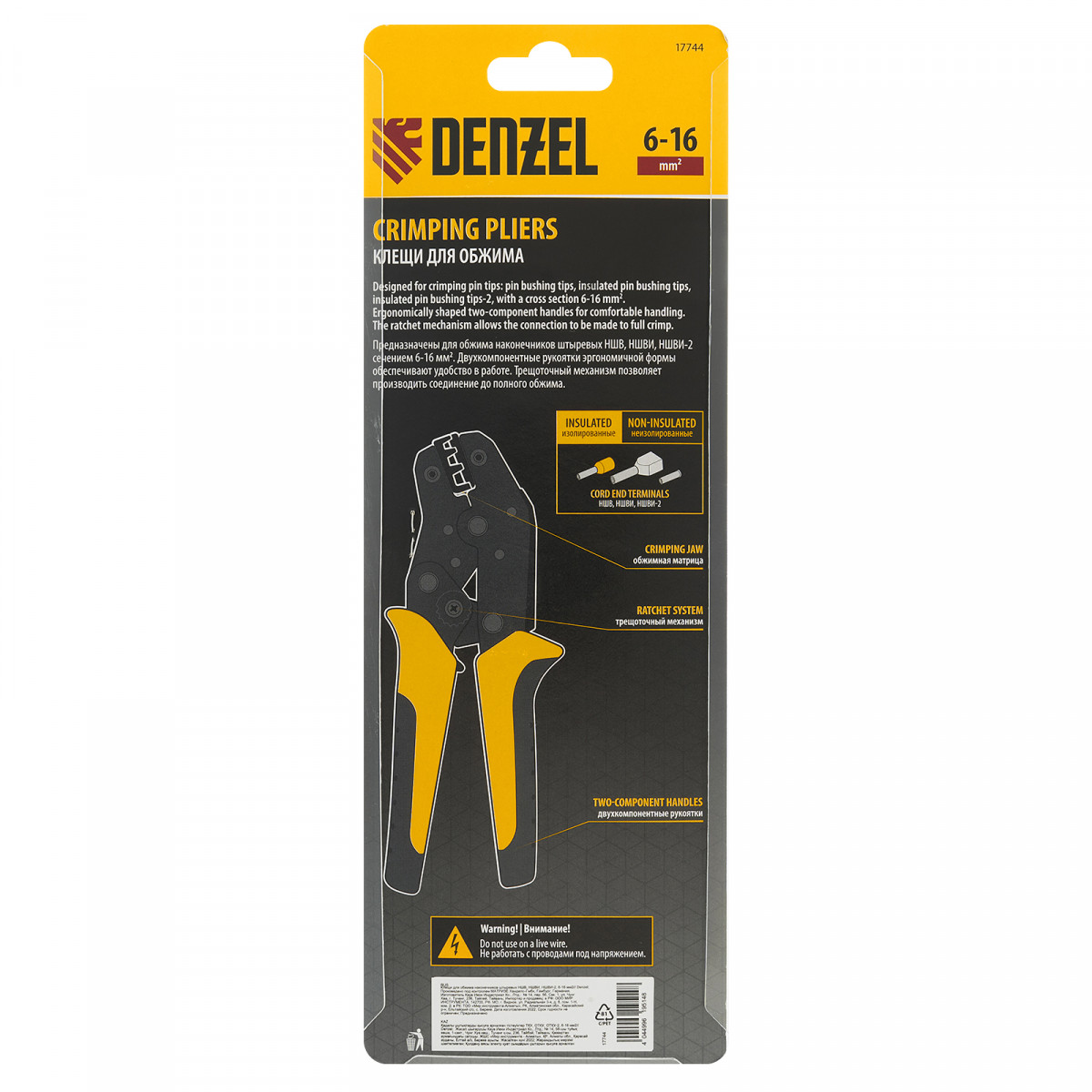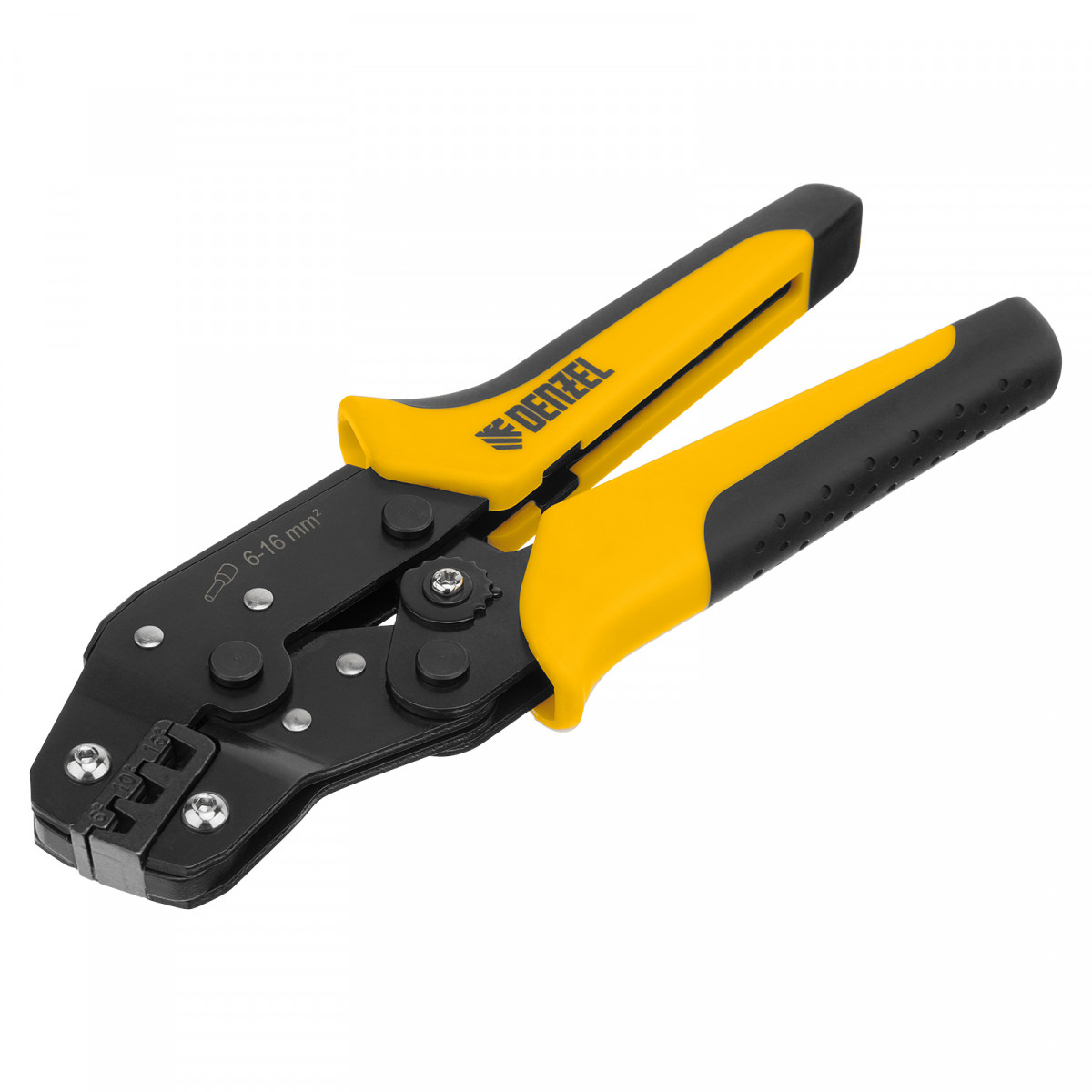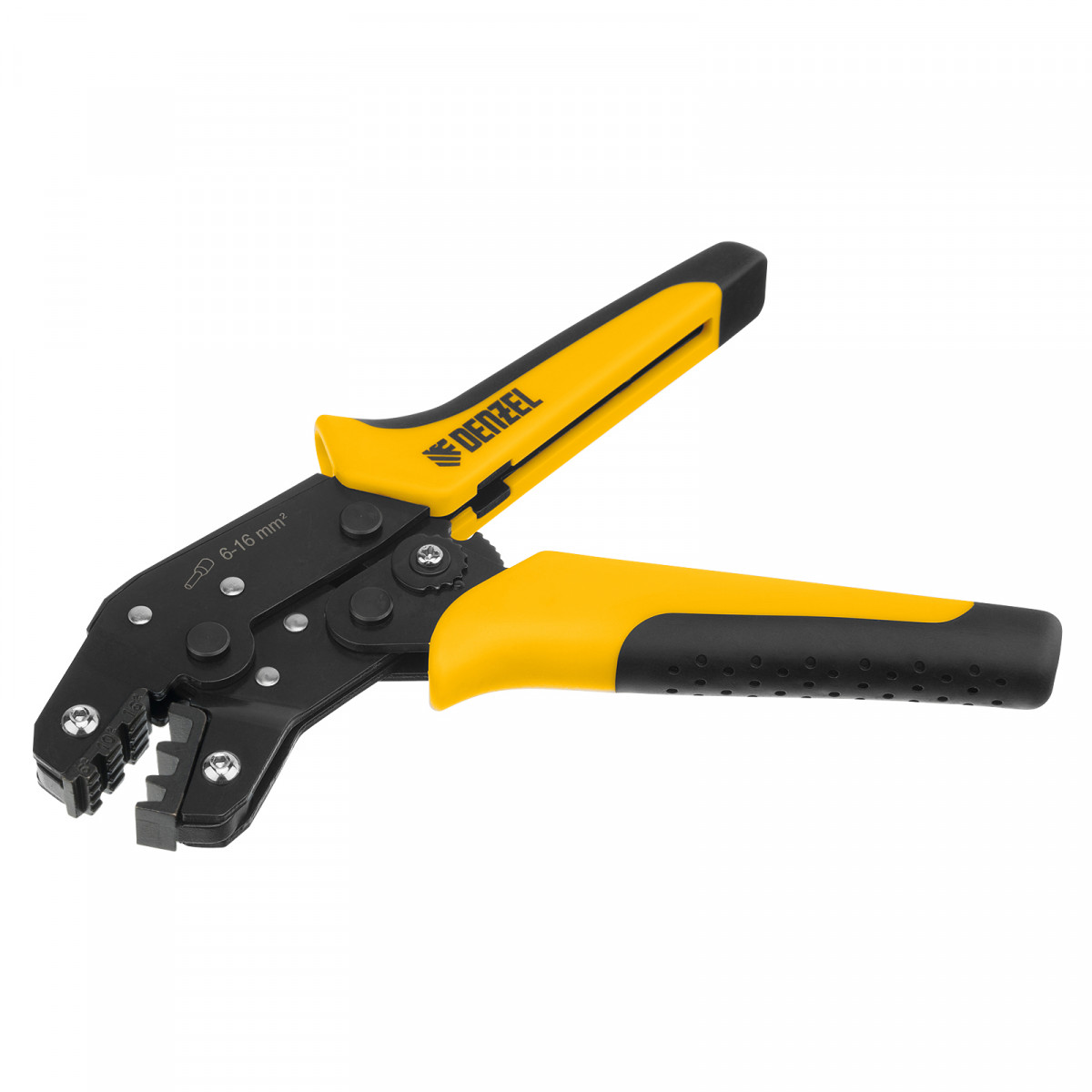 Клещи Denzel 17744 предназначены для обжима наконечников штыревых втулочных НШВ, НШВИ, НШВИ-2 сечением 6-16 мм². Двухрычажная передача усилия сжатия позволяет увеличить эффективность работы без дополнительный усилий мастера. Инструмент пригодится частным и профессиональным мастерам при проведении электромонтажных работ.