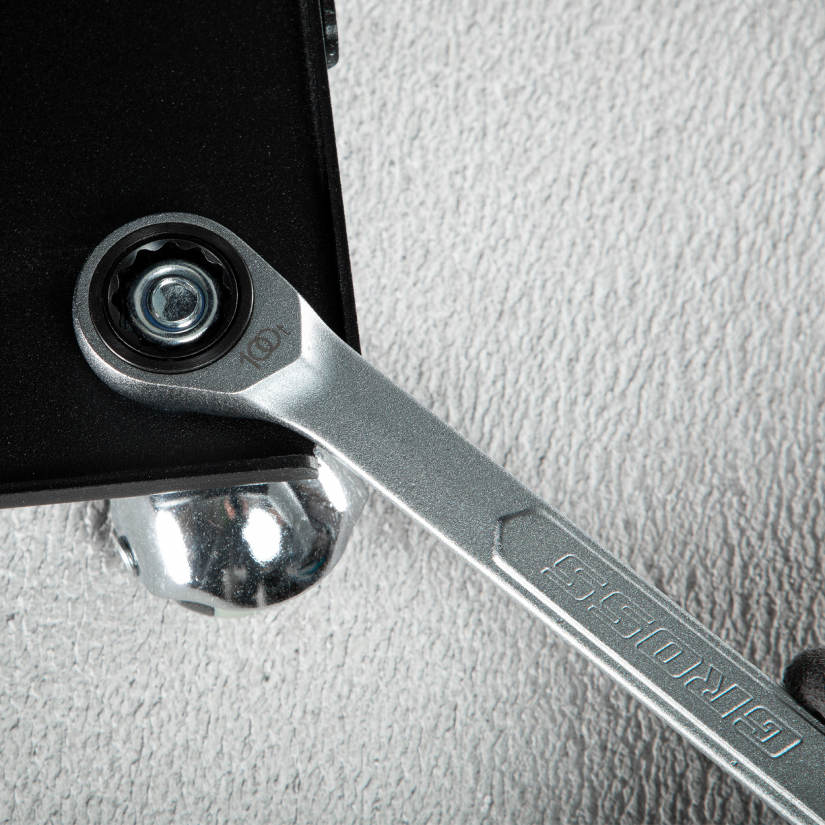 Храповый механизм с 100 зубцами обеспечивает шаг трещотки всего 3,6 градуса.