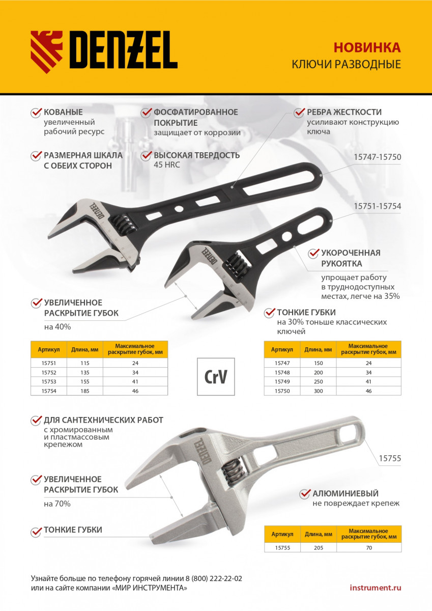 Усиленная кованая конструкция с дополнительными ребрами жесткости делает ключ Denzel износостойким и долговечным.