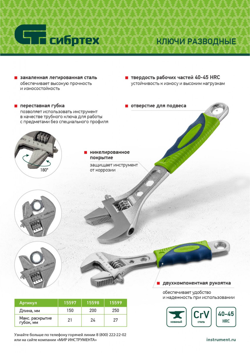 Разводной ключ Сибртех 15599 длиной 250 мм, с переставной губкой и двухкомпонентной рукояткой, предназначен для выполнения монтажных работ. Позволяет справляться с болтами разного размера и способен заменить целый арсенал гаечных ключей. Переставная губка с зазубринами позволяет использовать ключ для работы предметами без специального профиля, например, трубами.