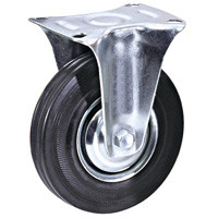 Колесная опора неповоротная, обод - прессованный из листовой стали, шинка - литая черная резина, платформенное крепление, роликоподшипник.