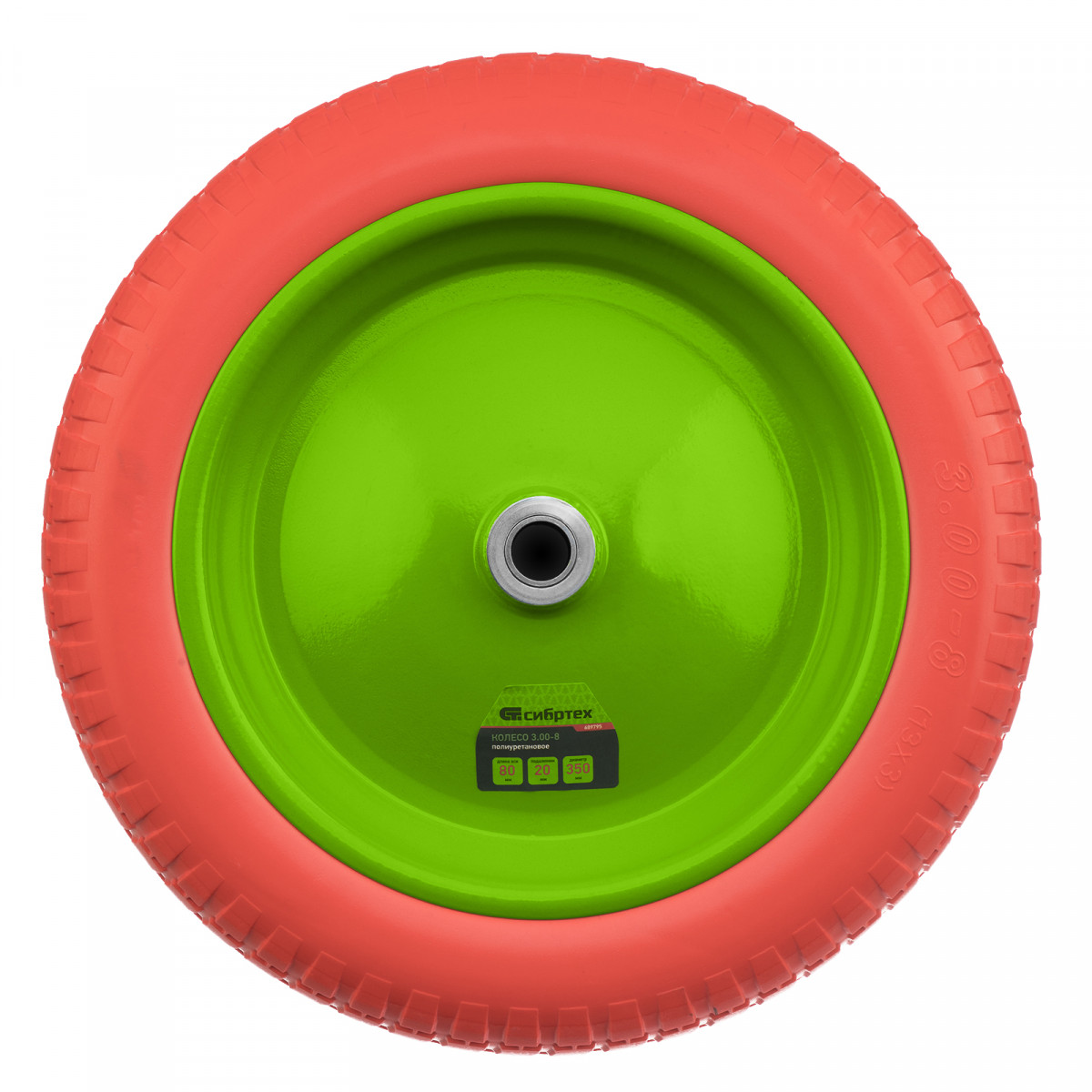 Полиуретановое колесо 3.00-8 Сибртех 689795 с длиной оси 80 мм и диаметром подшипника 20 мм — движущий элемент тачки 68936. Непрокалываемое колесо подходит для использования в самых жестких условиях. В отличие от пневматических колес не требует подкачки, обслуживания и легко отмывается от грязи.
