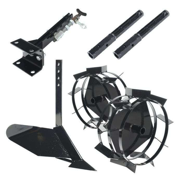 Комплект навески для мотоблоковКНО-М включает в себя — грунтозацепы диаметром 400 мм., сцепка, окучник, удлинители.