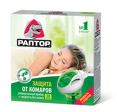 Комплект "Раптор" состоит из универсального прибора и жидкости, рассчитанной на 30 ночей защиты от комаров.