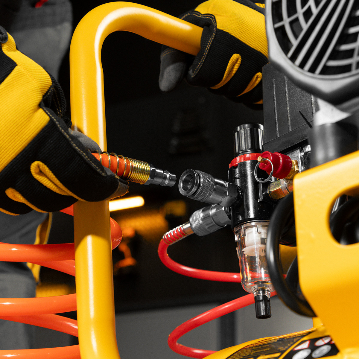 • Простая подготовка к работе — благодаря быстросъемному выходному коннектору подключение пневмоинструмента занимает несколько секунд.