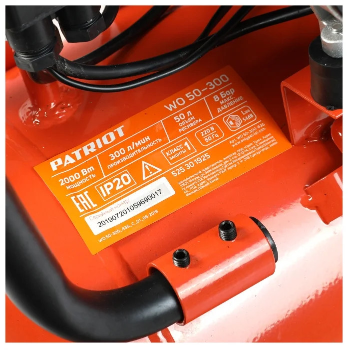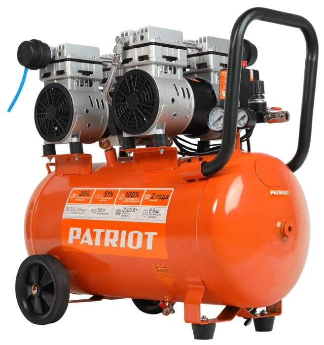- Поршневой безмасляный компрессор PATRIOT WO 50-300 525301925 готов к работе сразу после покупки, не требует заправки маслом, а так же контроля за наличием масла и его замены