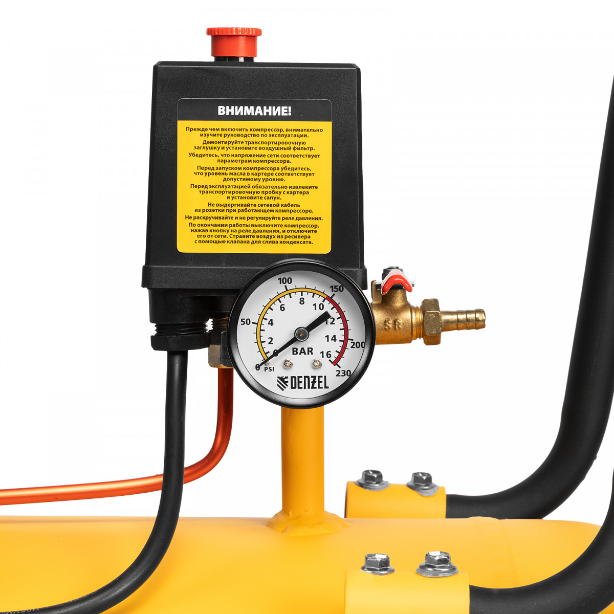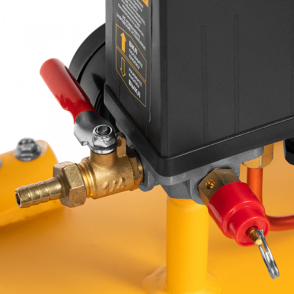 • Автоматический спускной клапан — лишнее давление быстро сбрасывается без вреда для компрессора.