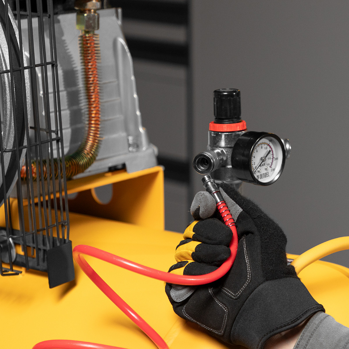 • 2 больших манометра — мастеру удобно отслеживать давление в ресивере и на выходной магистрали.