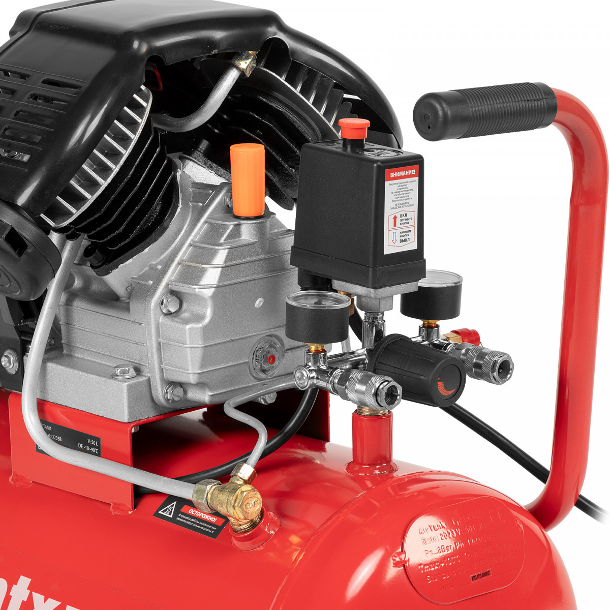 • Автономная работа — прессостат обеспечивает автоматическую остановку двигателя по достижении максимального рабочего давления и запуск при падении давления до минимального уровня.
