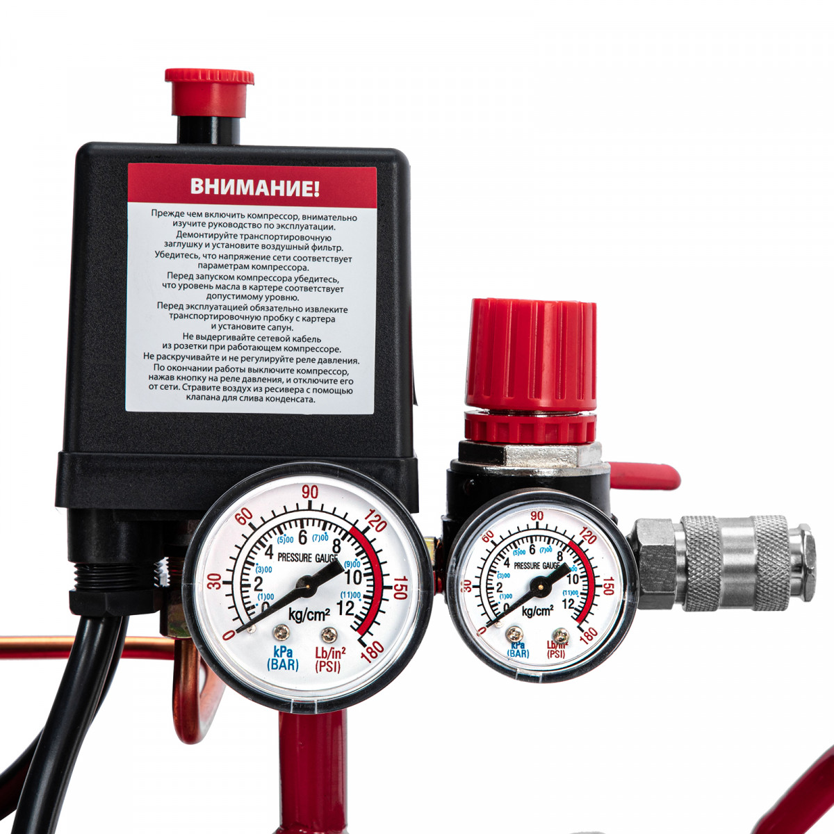 • Автоматическая регулировка производительности — прессостат останавливает двигатель при достижении максимального рабочего давления (8 бар) и запускает его при падении давления ниже минимально допустимого уровня.
