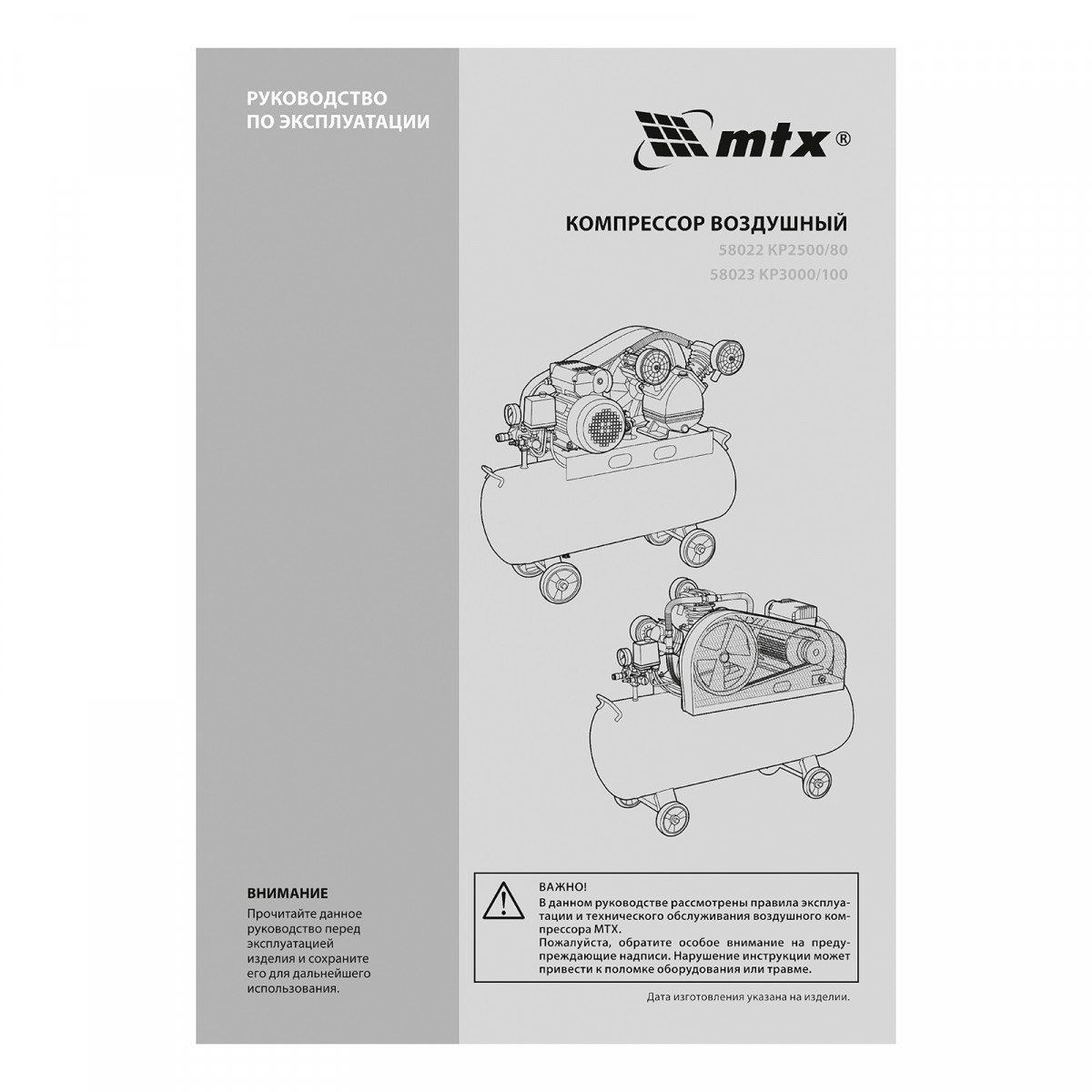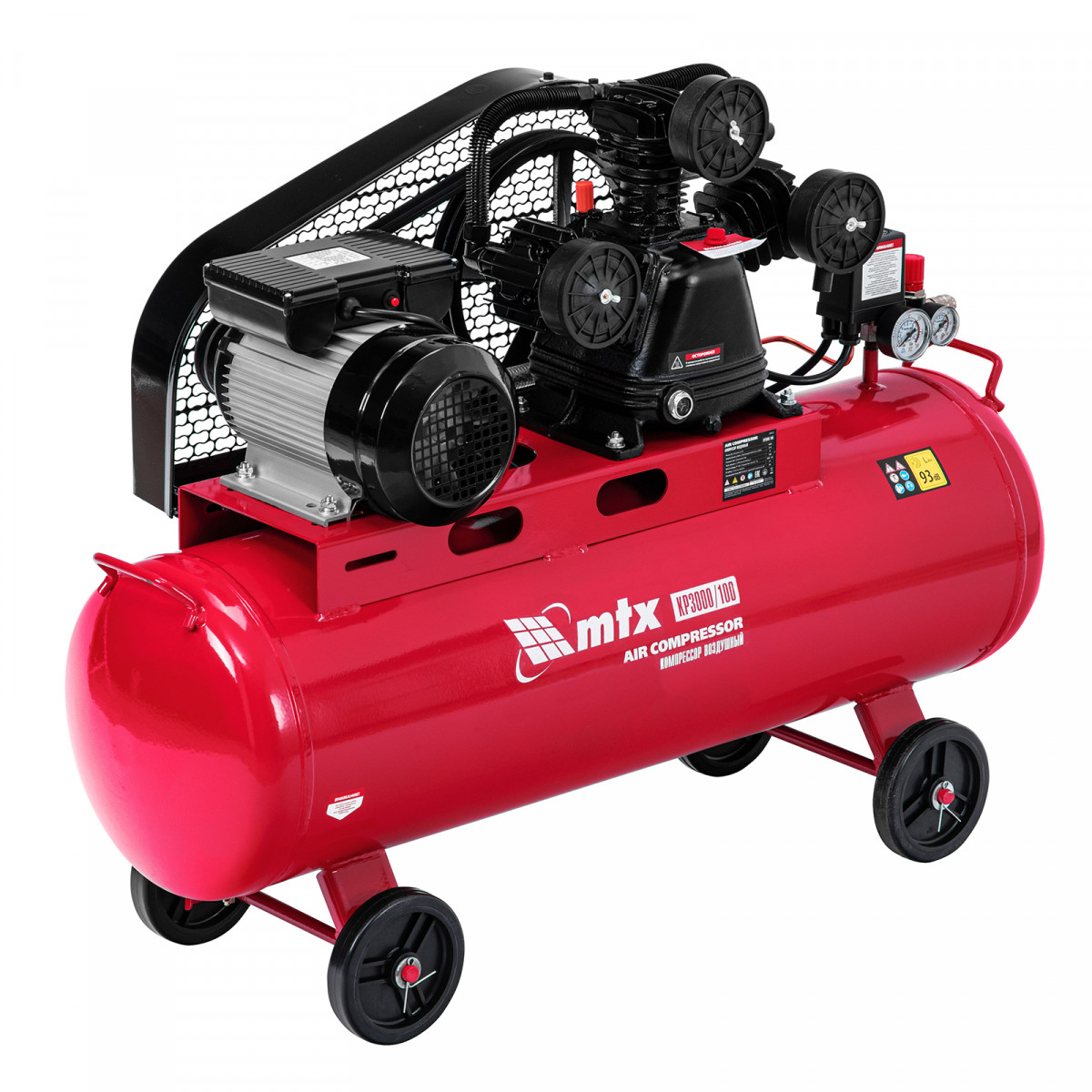 Компрессор воздушный МТХ КР3000/100 58023 с ременным приводом от электродвигателя, мощностью 3,0 кВт и производительностью 510 л/мин, с ресивером объемом 100 литров, применяется для подачи сжатого атмосферного воздуха к пневматическому инструменту. К нему можно подключить гайковерт, дрель, углошлифовальную машину, степлер, краскопульт, продувочный пистолет или другой пневмоинструмент. Для подключения предусмотрены 2 штуцера: быстросъемный и «елочка». Компрессор подходит для профессионального использования на предприятии автосервиса, строительной площадке, в мастерской.