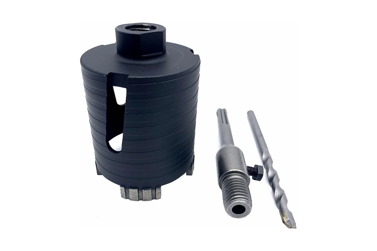 В комплект входит адаптер с хвостовиком SDS+ и центровочным сверлом, позволяющим надежно фиксировать коронку во время начала сверления.